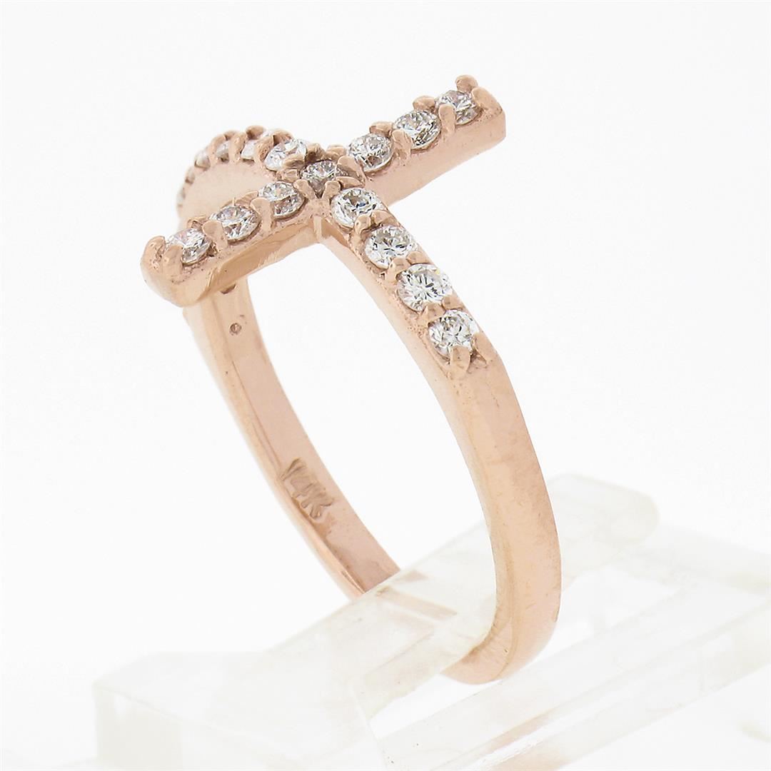 A new solid 14k rose gold cross ring with 20 round brilliant cut natural diamonds (G/H - VS1/VS2 ; 0.40ctw). The ring is size 6.5, weighs a total of 2.65 grams, and measures 13.30mm wide.