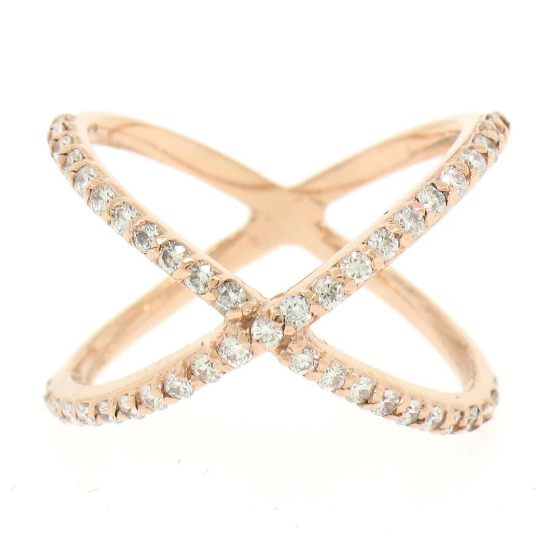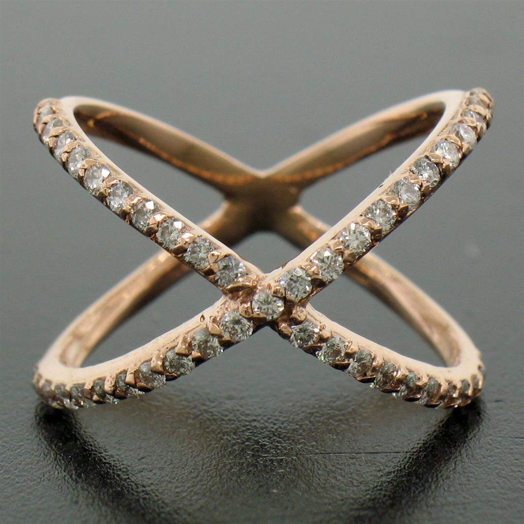 A new solid 14k rose gold X ring, with 45 round brilliant cut natural diamonds (G - VS2 ; 0.50ctw). The ring is size 5.75, weighs a total of 3.0 grams, and measures 13.60mm wide.