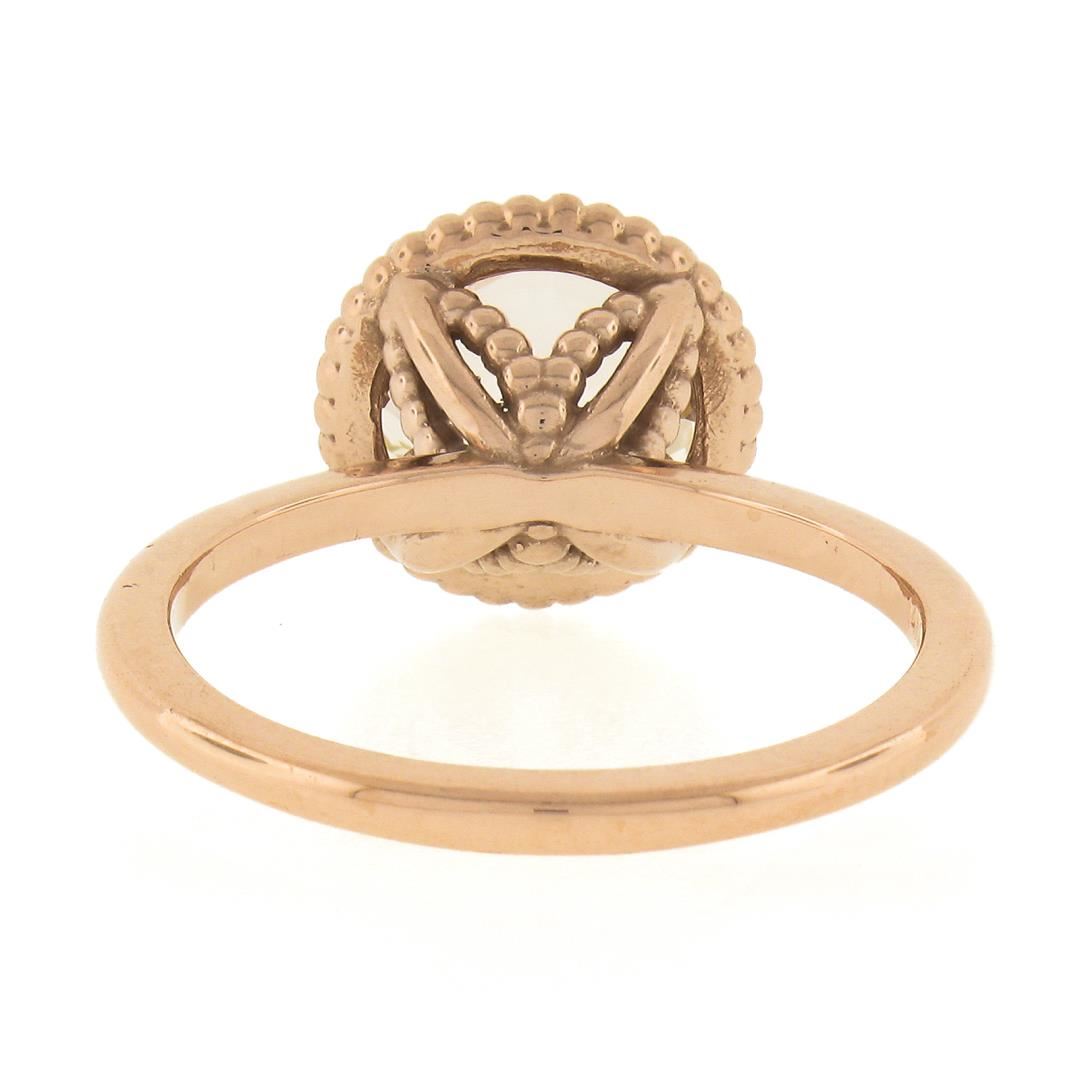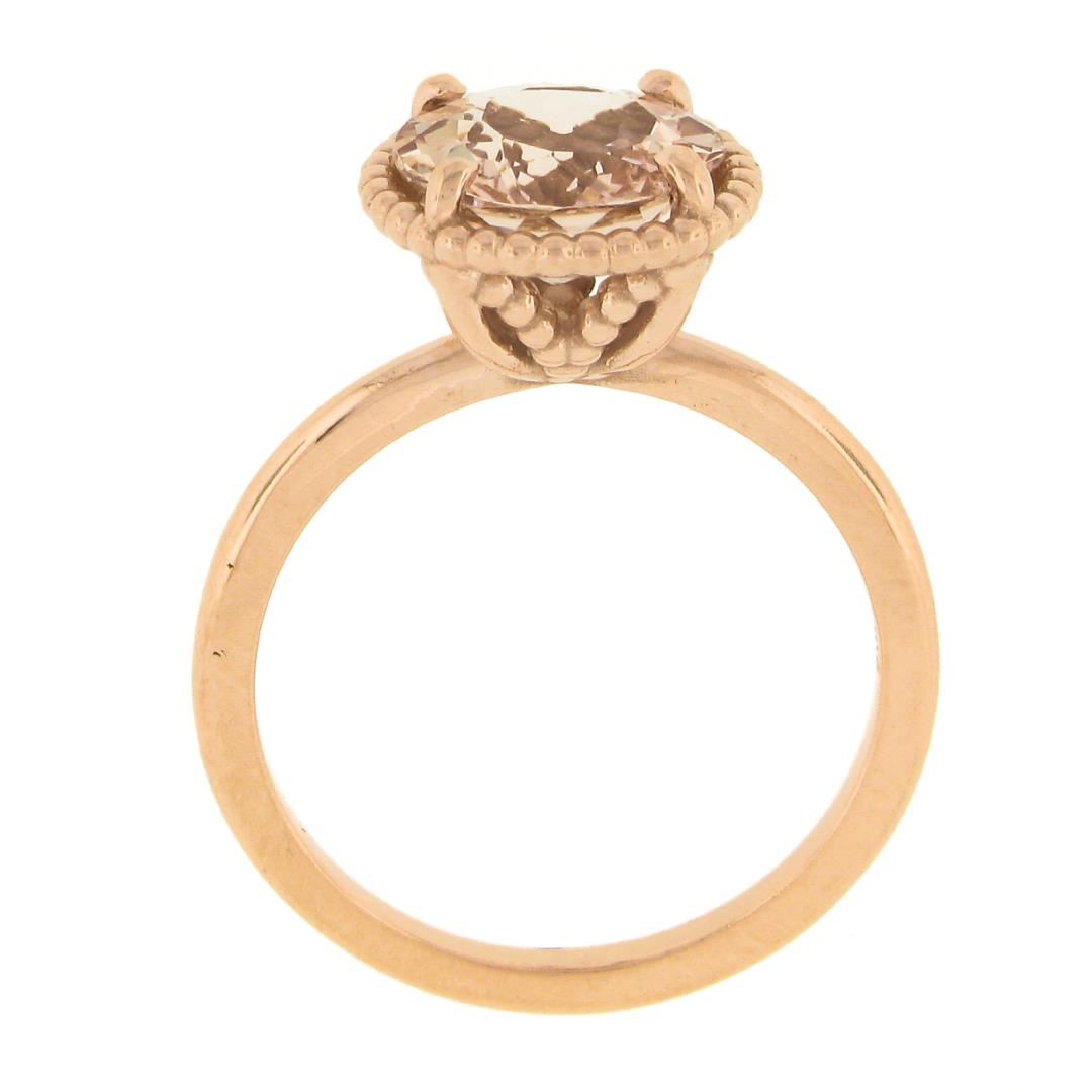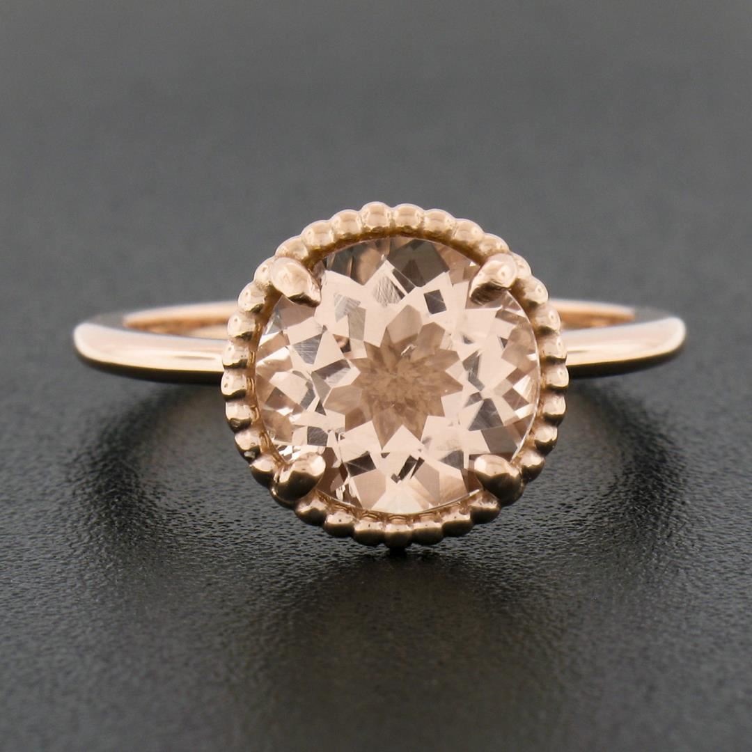 A new solid 14k rose gold soliatire ring, with 1 round cut natural morganite (1.98ctw). The ring is size 7.0, weighs a total of 3.72 grams, and measures 11mm wide.