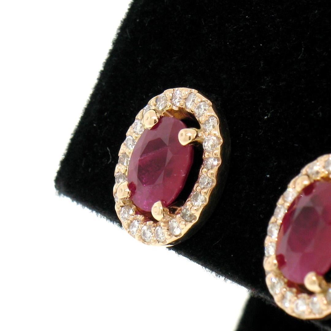 A new solid 14k rose gold pair of stud earrings, featuring 2 oval cut natural rubies (2.19ctw), surrounded with a halo of 42 round brilliant cut natural diamonds (G- VS2; 0.35ctw). The earrings measure approximately 11.60x9.59mm and weigh a total of 3.5 grams.