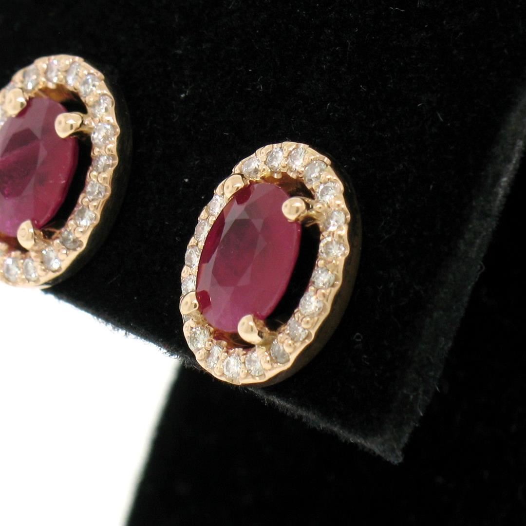 A new solid 14k rose gold pair of stud earrings, featuring 2 oval cut natural rubies (2.19ctw), surrounded with a halo of 42 round brilliant cut natural diamonds (G- VS2; 0.35ctw). The earrings measure approximately 11.60x9.59mm and weigh a total of 3.5 grams.