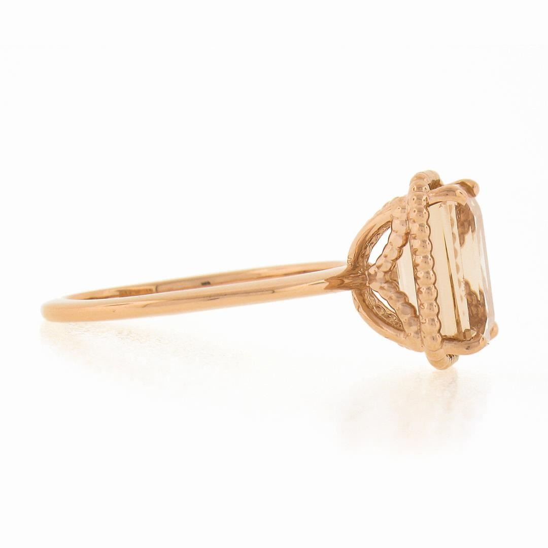 A new solid 14k rose gold solitaire ring, with 1 emerald cut natural morganite (3.13ct). The ring is size 7.0, weighs a total of 3.66 grams, and measures 12mm wide.