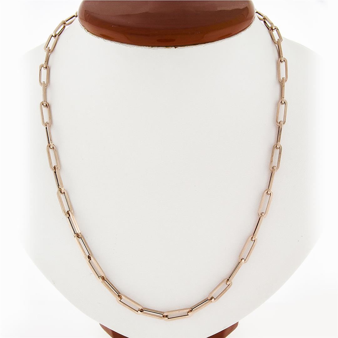 A new solid 14k rose gold oval paperclip chain necklace. It weighs a total of 13.33 grams, measures 4.5mm wide, and measures 30 inches in length.