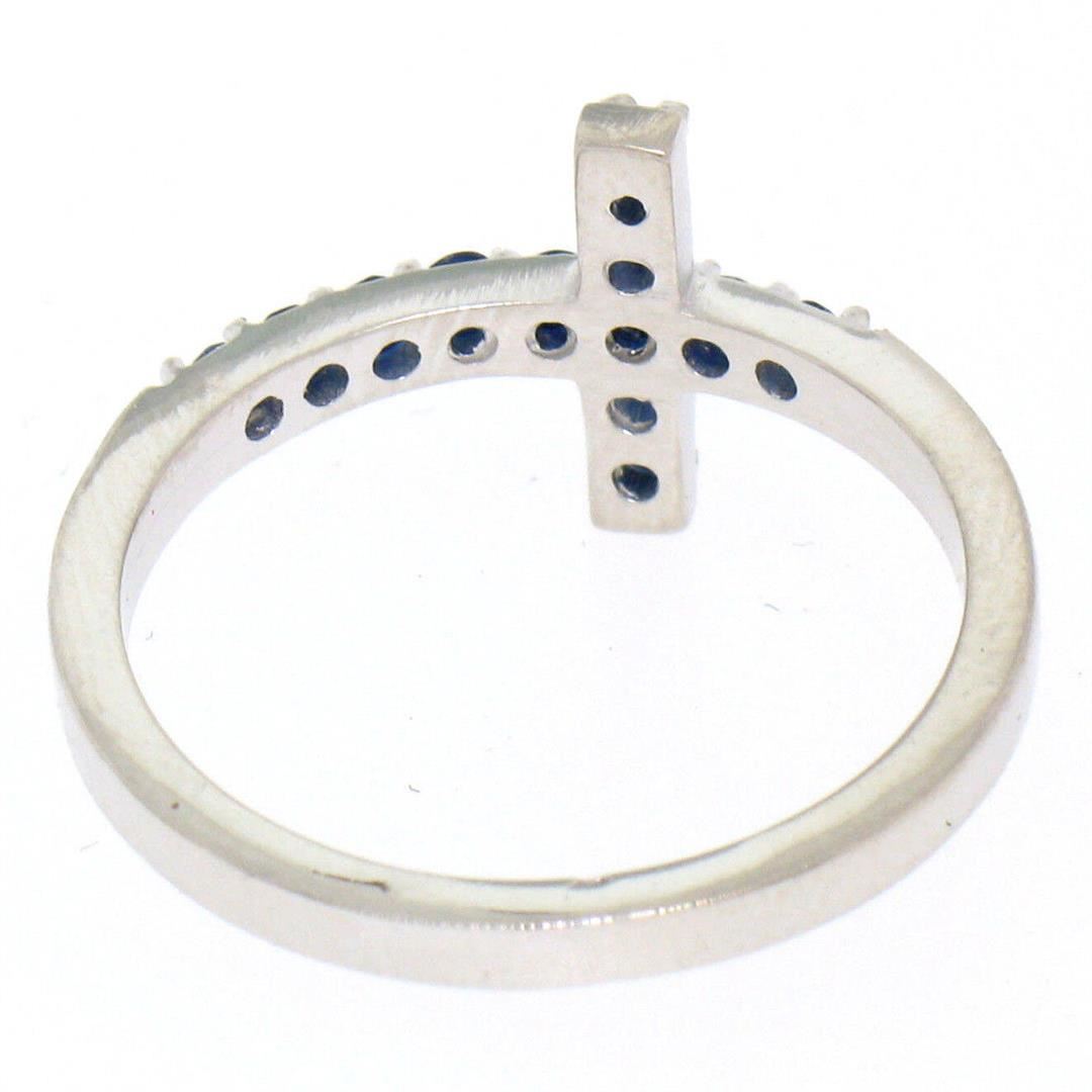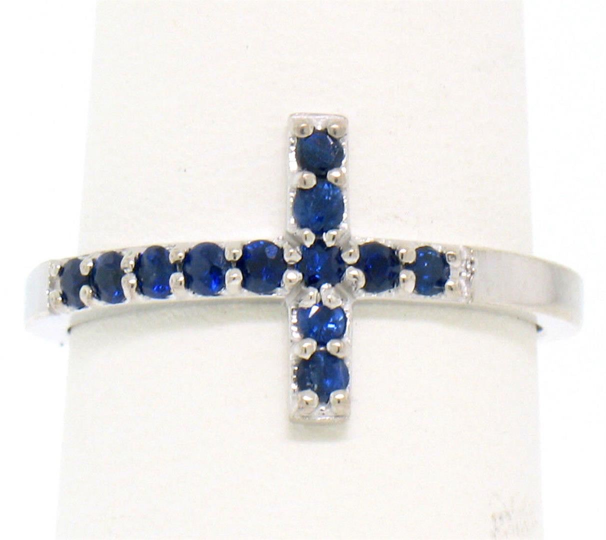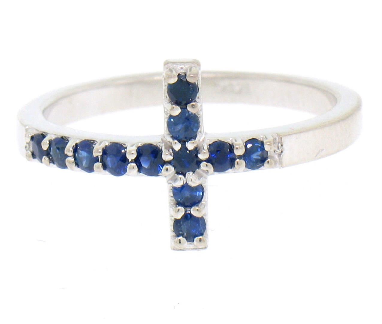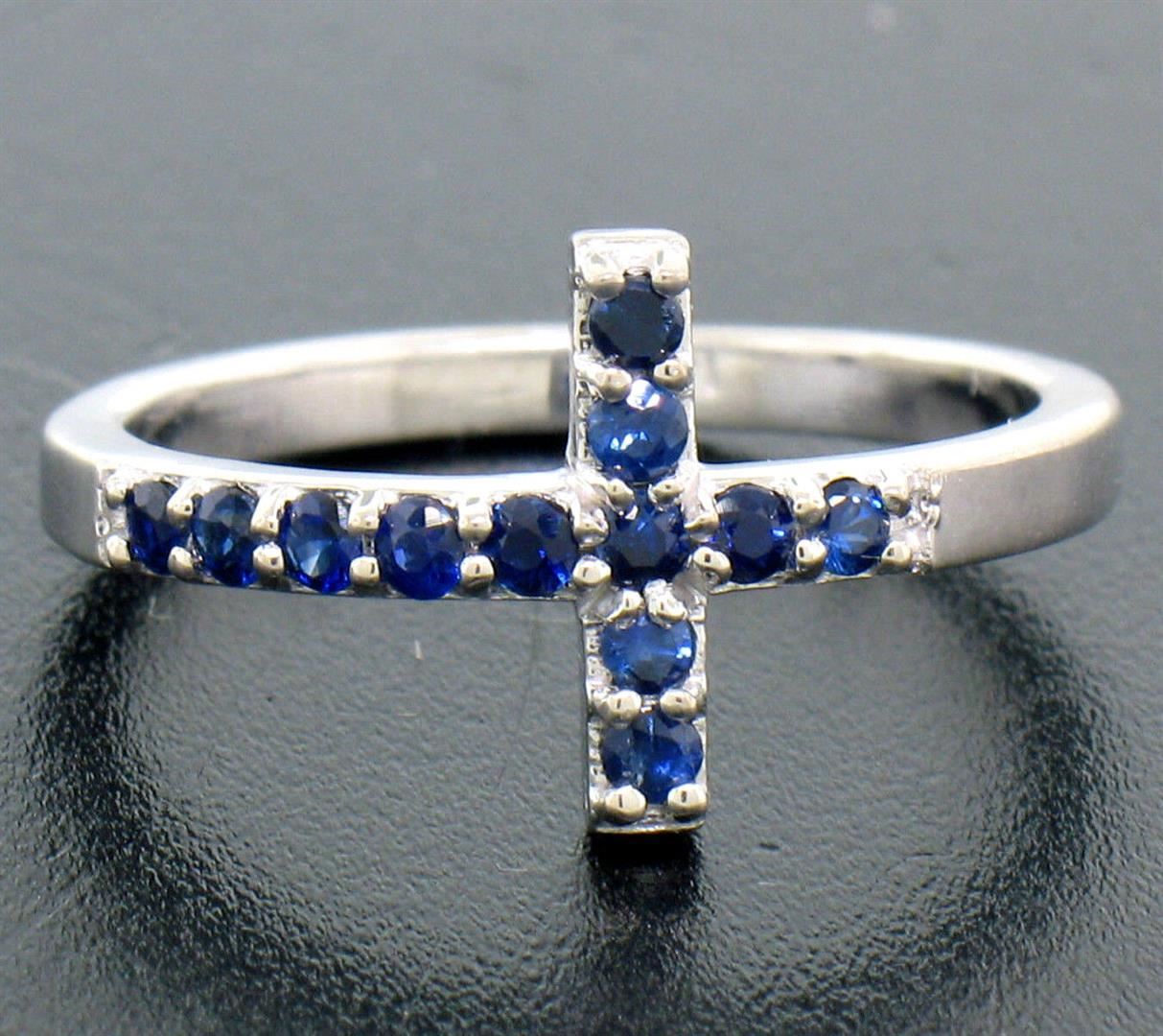 A new solid 14k white gold cross band ring, with 12 round brilliant cut natural sapphires (0.25ctw). The ring is size 6.0, weighs a total of 2.3 grams, and measures 11.0mm wide.