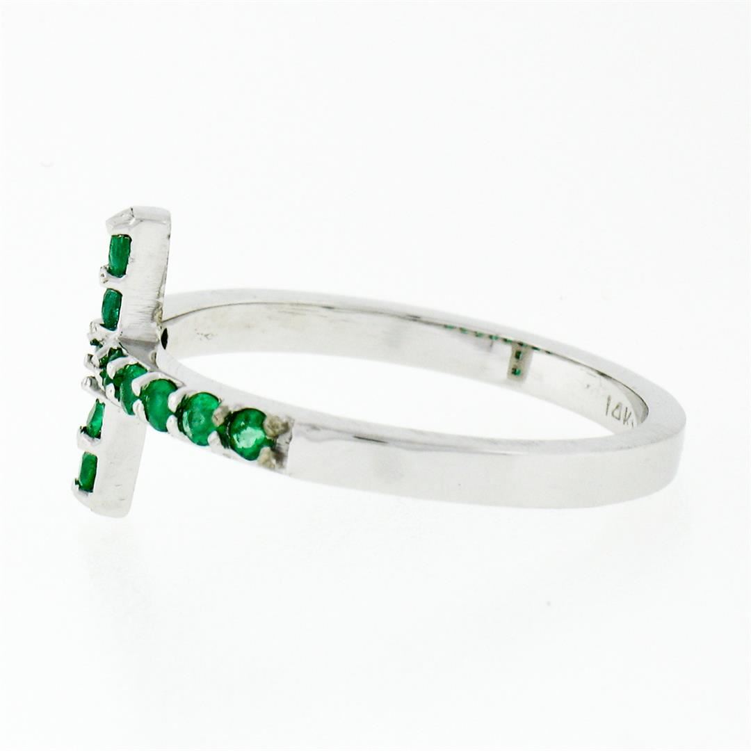 A new solid 14k white gold cross band ring, with 12 round brilliant cut natural emeralds (0.25ctw). The ring is size 6.0, weighs a total of 2.25 grams, and measures 11mm wide.