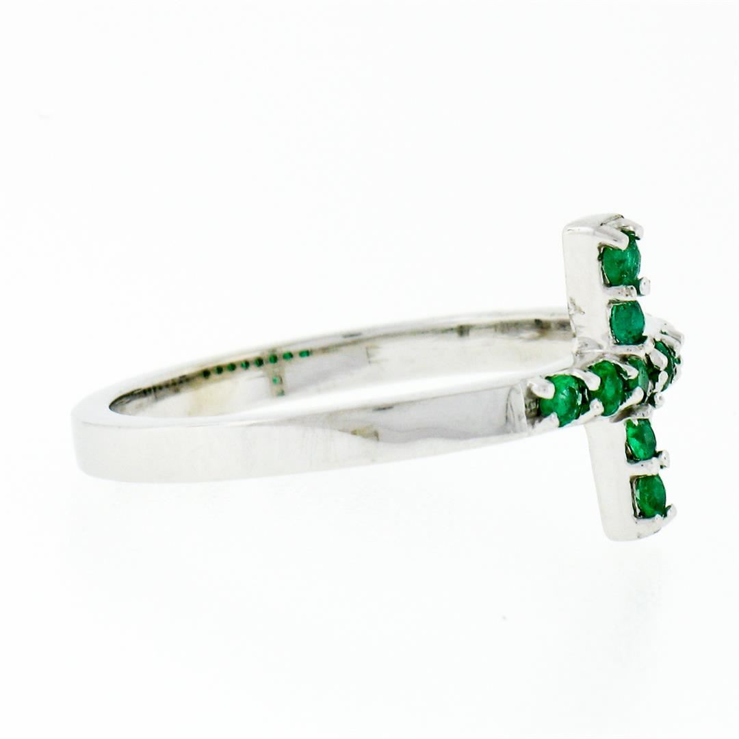 A new solid 14k white gold cross band ring, with 12 round brilliant cut natural emeralds (0.25ctw). The ring is size 6.0, weighs a total of 2.25 grams, and measures 11mm wide.