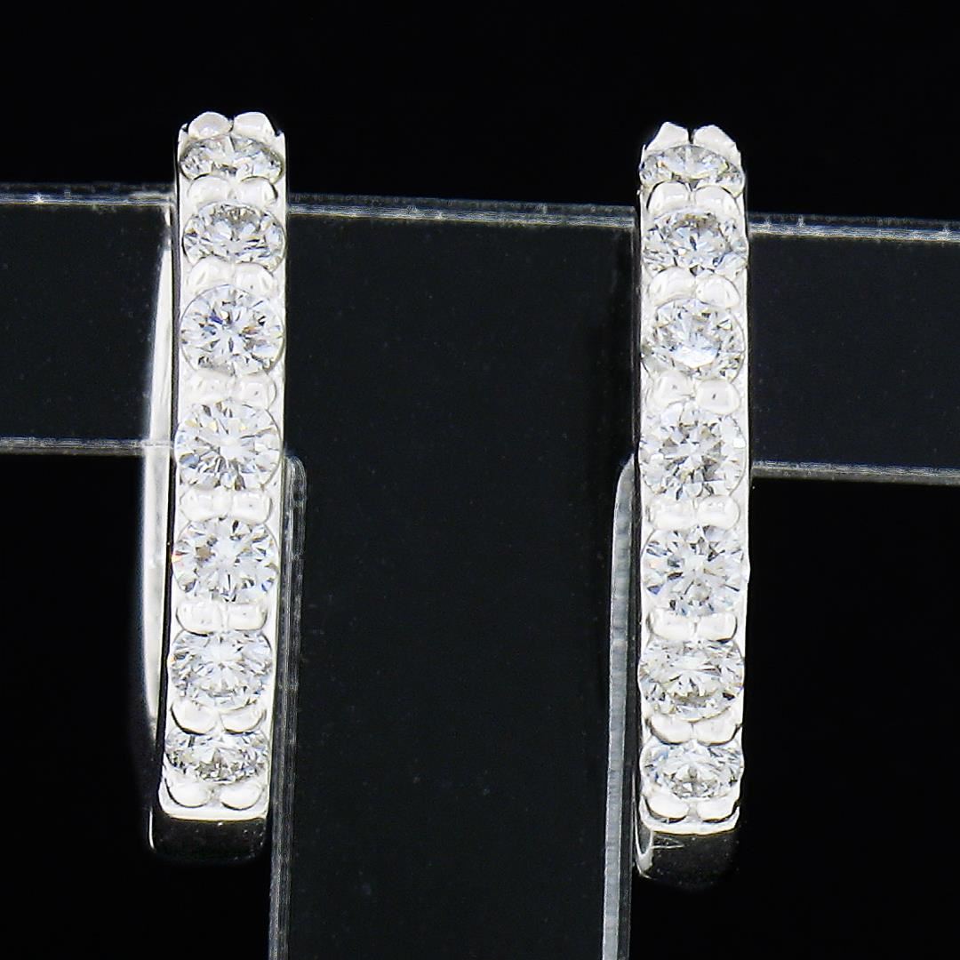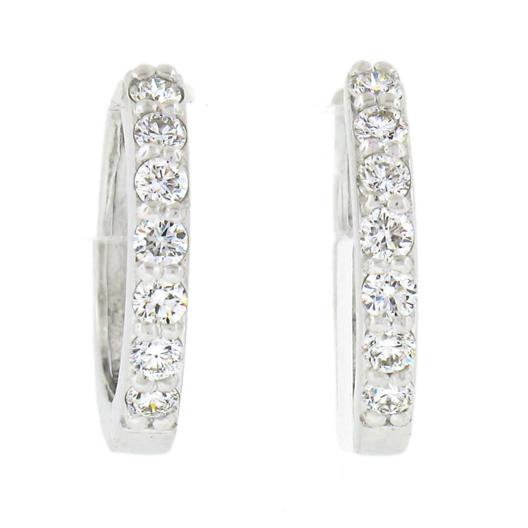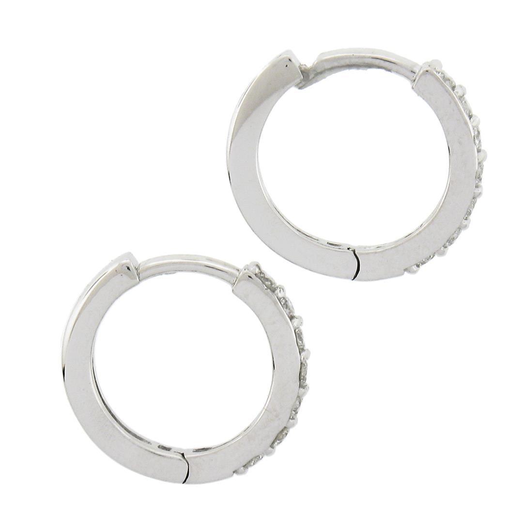 A new solid 14k white gold hoop earrings, with 14 round brilliant cut natural diamonds (F/G - VS1/VS2 ; 0.28ctw). The earrings measure approximately 12.3x1.9mm and weigh a total of 1.68 grams.