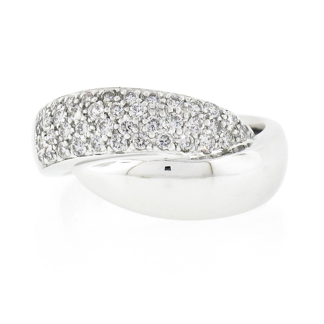 A new solid 14k white gold crossover band ring, with numerous of round brilliant cut natural diamonds (G/H - VS1/VS2 ; 0.52ctw). The ring is size 7.0, weighs a total of 5.48 grams, and measures 10.55mm wide.