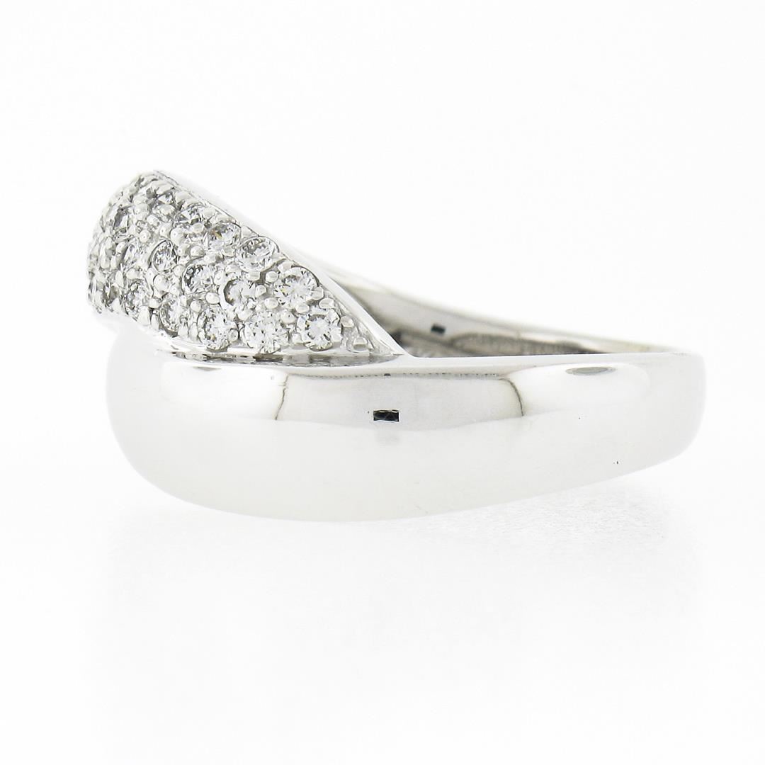 A new solid 14k white gold crossover band ring, with numerous of round brilliant cut natural diamonds (G/H - VS1/VS2 ; 0.52ctw). The ring is size 7.0, weighs a total of 5.48 grams, and measures 10.55mm wide.
