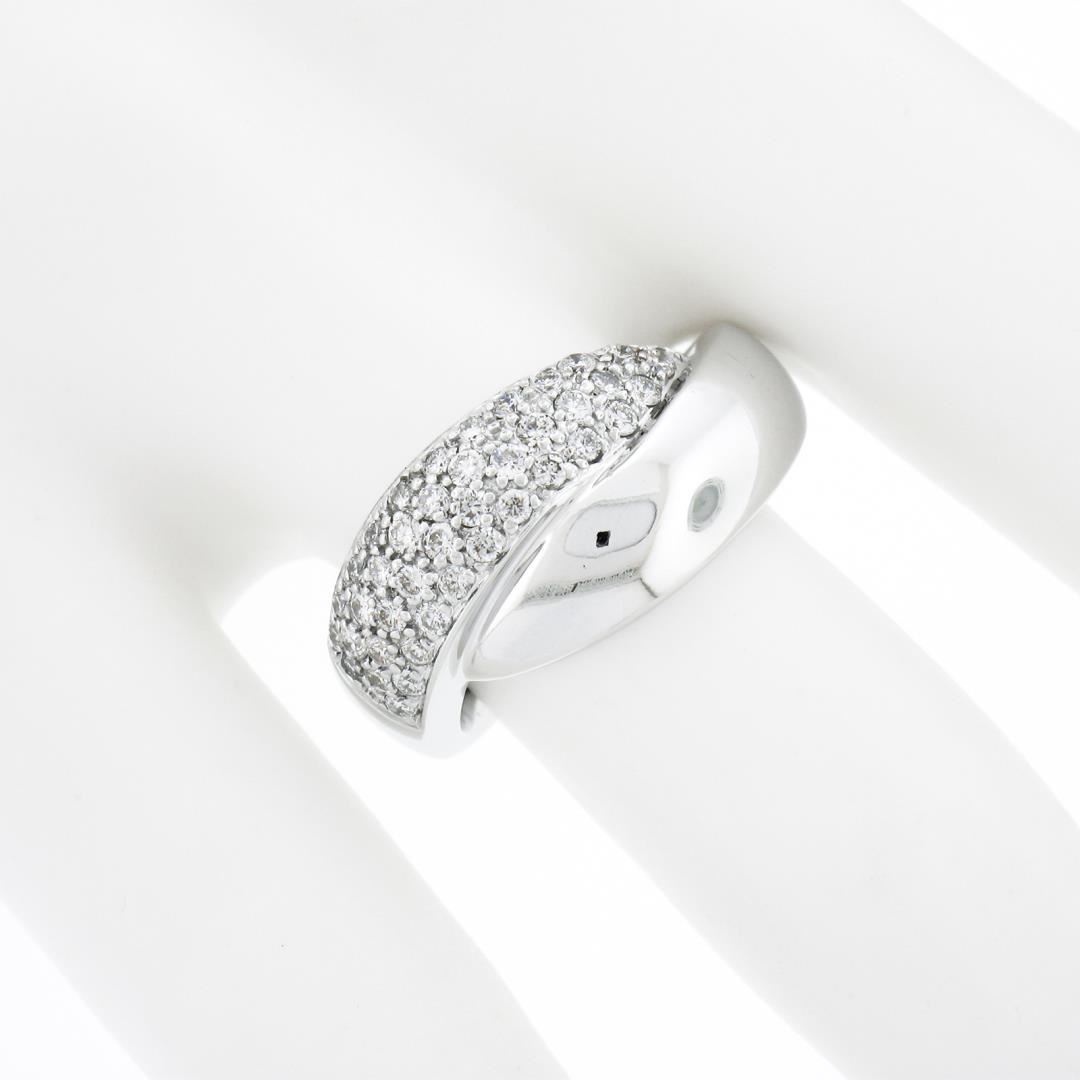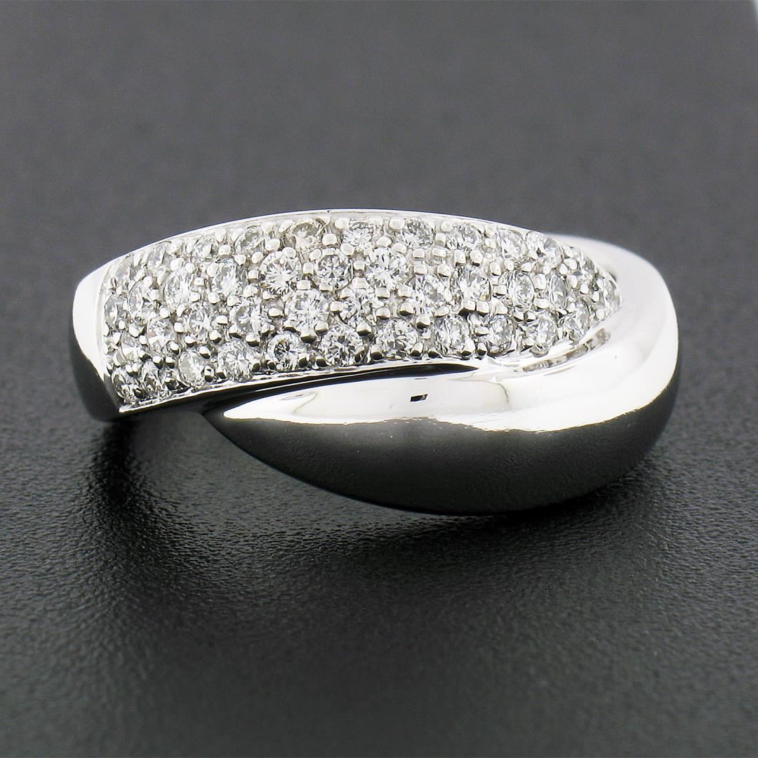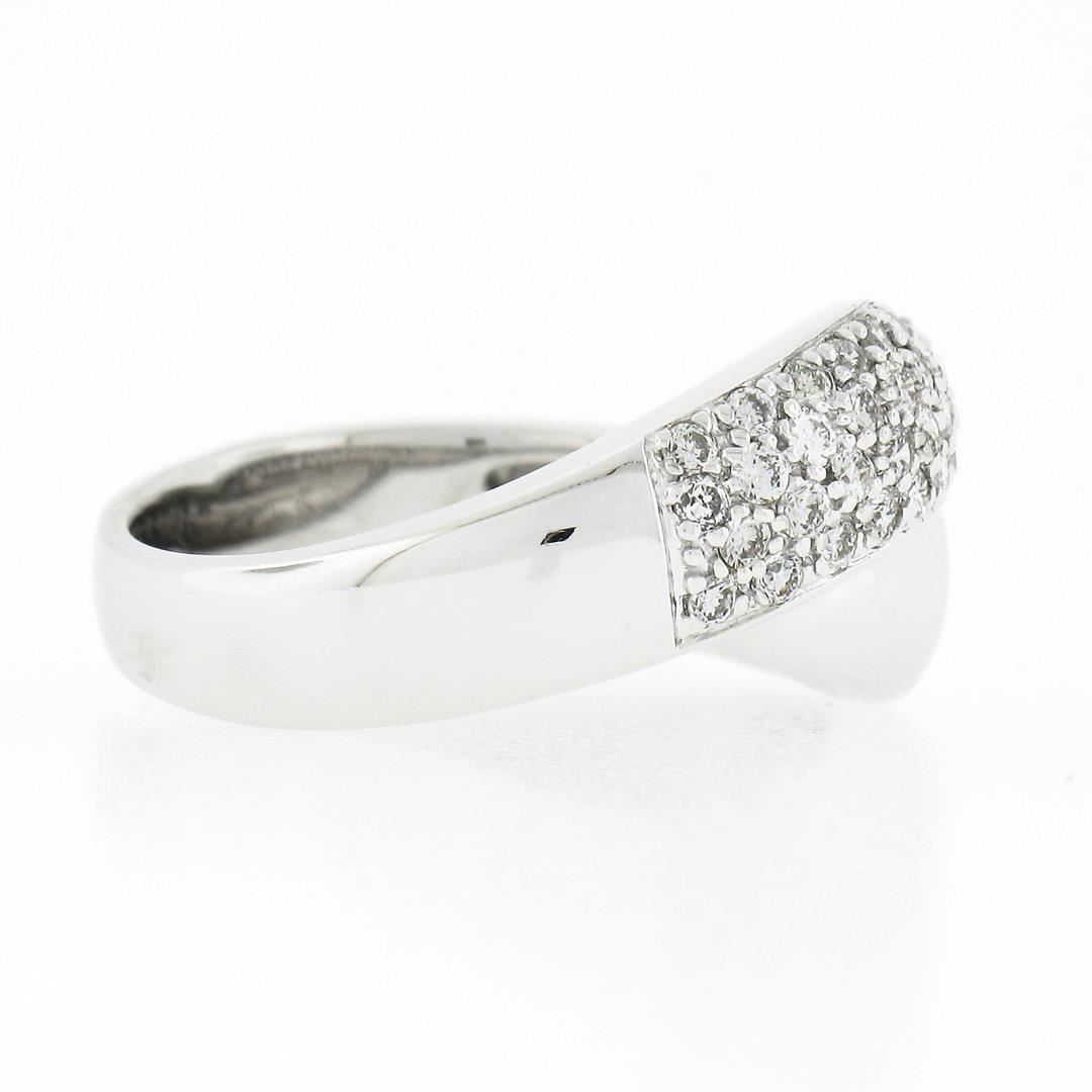 A new solid 14k white gold crossover band ring, with numerous of round brilliant cut natural diamonds (G/H - VS1/VS2 ; 0.52ctw). The ring is size 7.0, weighs a total of 5.48 grams, and measures 10.55mm wide.
