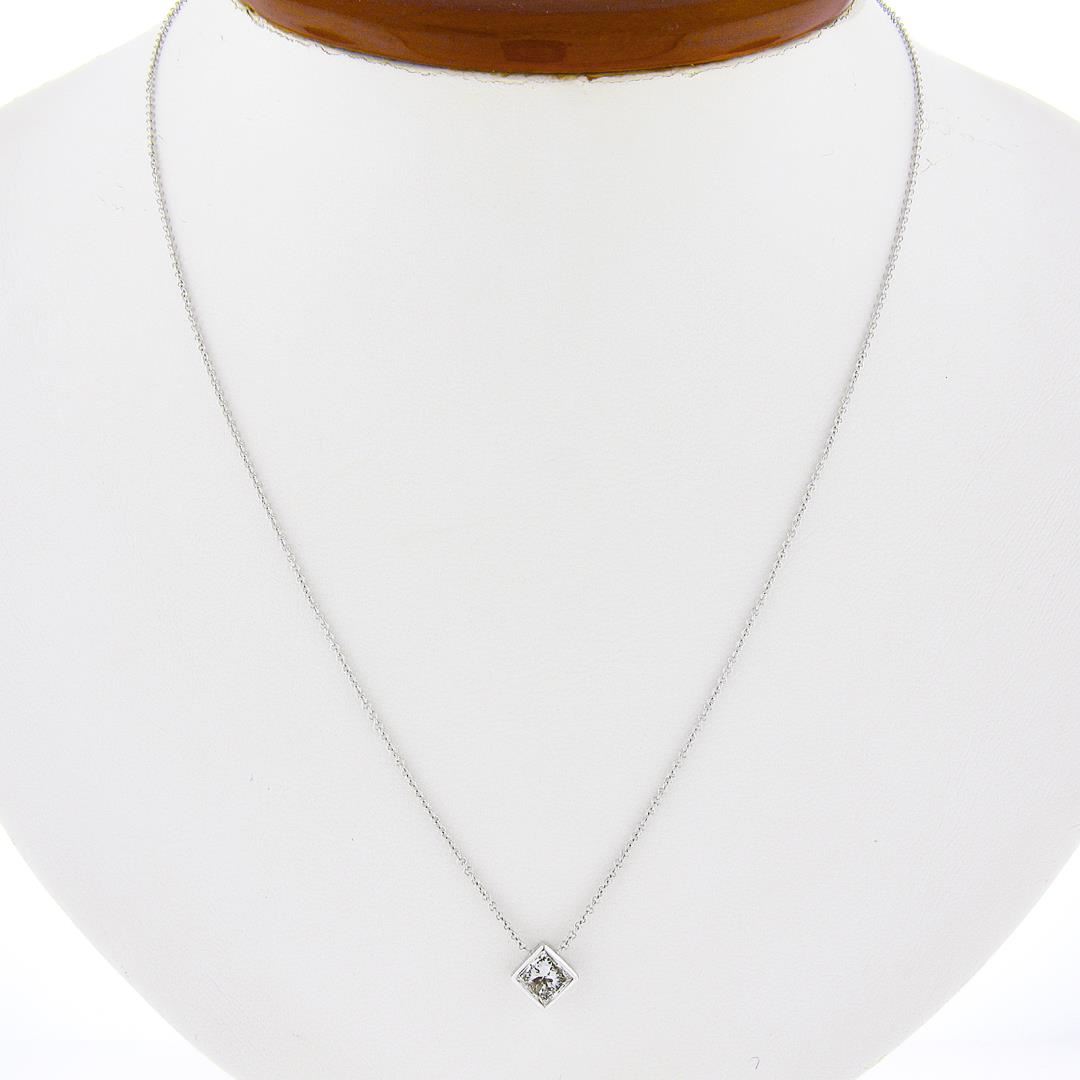 A new solid 14k white gold pendant necklace, with 1 princess cut natural diamond (H - I1 ; 0.59ct). Adjustabel 16 & 18 inch cable link chain, 2.13 grams total weight, pendant measures 7.65x7.65mm.
