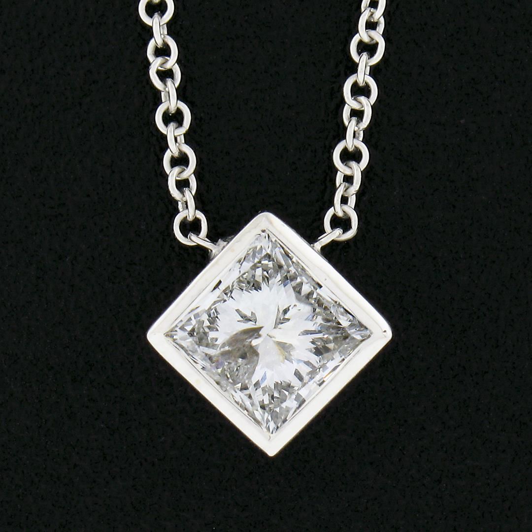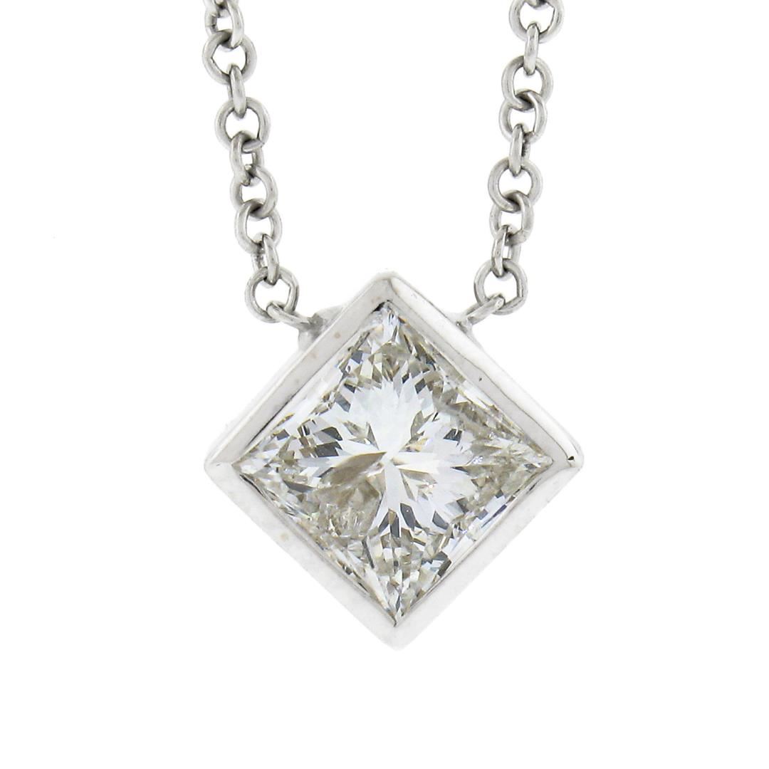 A new solid 14k white gold pendant necklace, with 1 princess cut natural diamond (H - I1 ; 0.59ct). Adjustabel 16 & 18 inch cable link chain, 2.13 grams total weight, pendant measures 7.65x7.65mm.