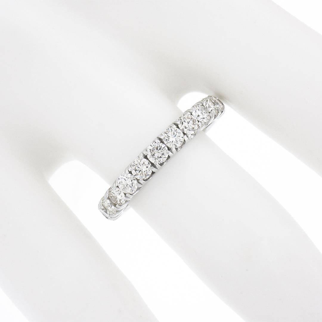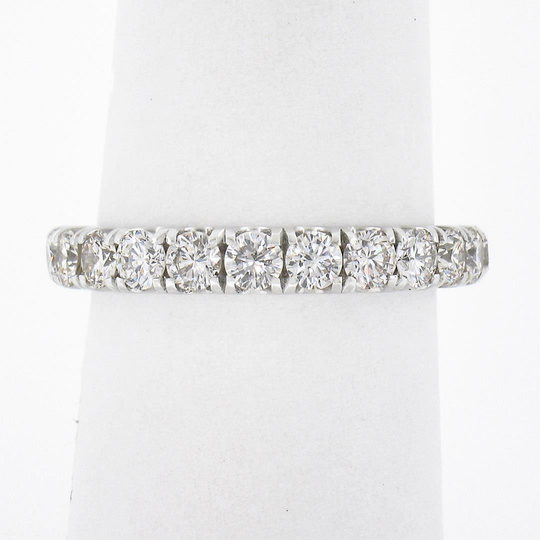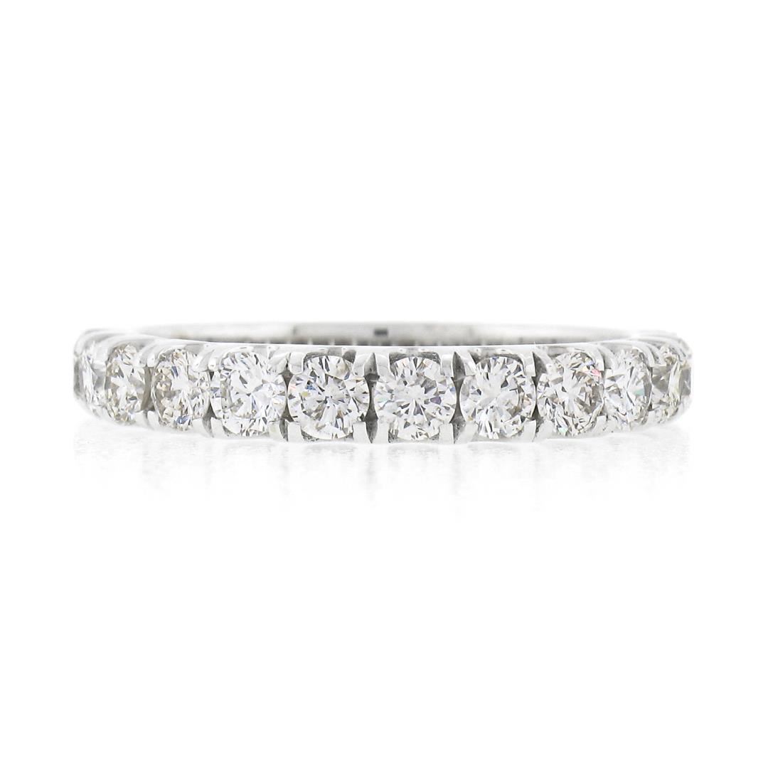A new solid 14k white gold band ring, with 13 round brilliant cut natural diamonds (H/I - VS2/SI1 ; 1.03ctw). The ring is size 6.5, weighs a total of 3.0 grams, and measures 3.2mm wide.