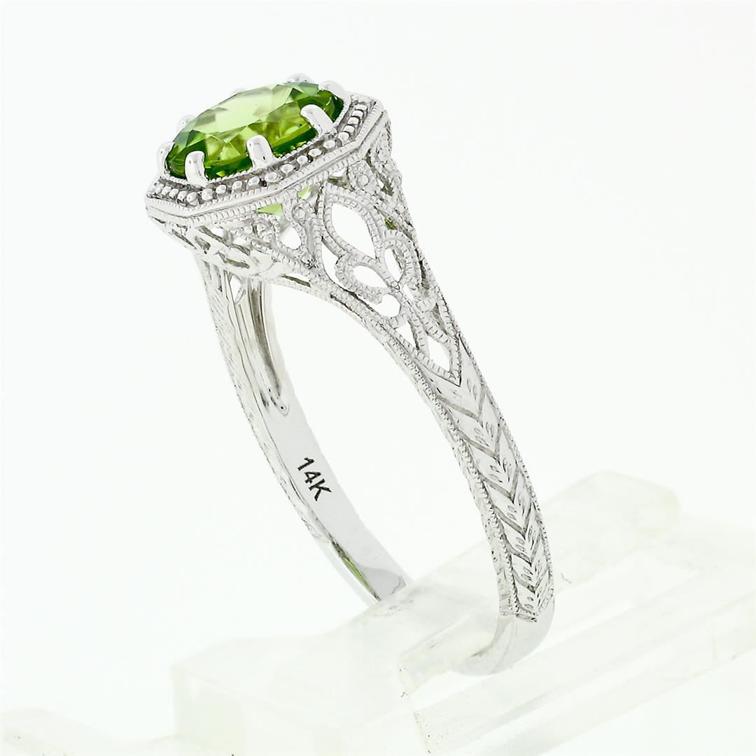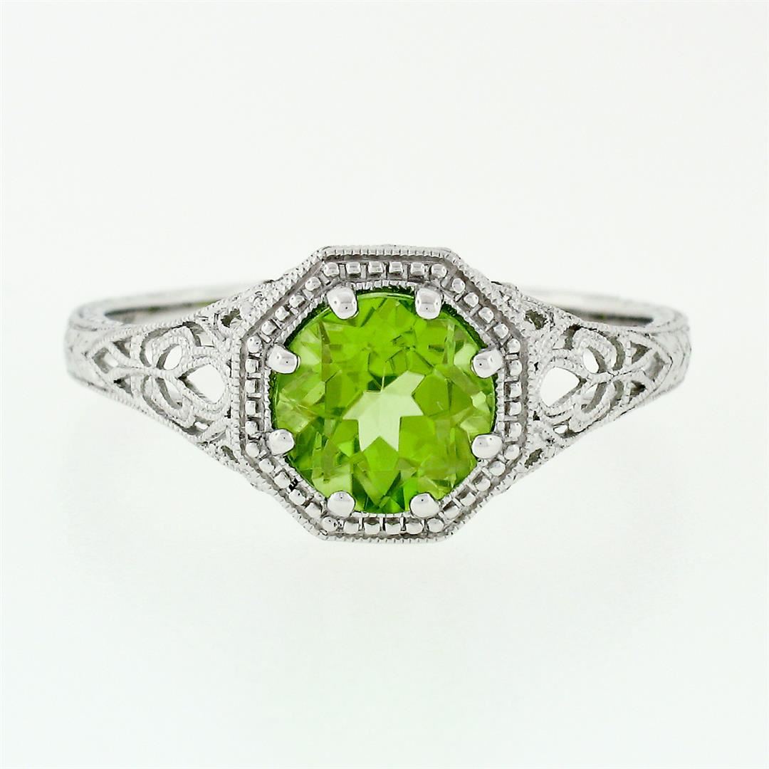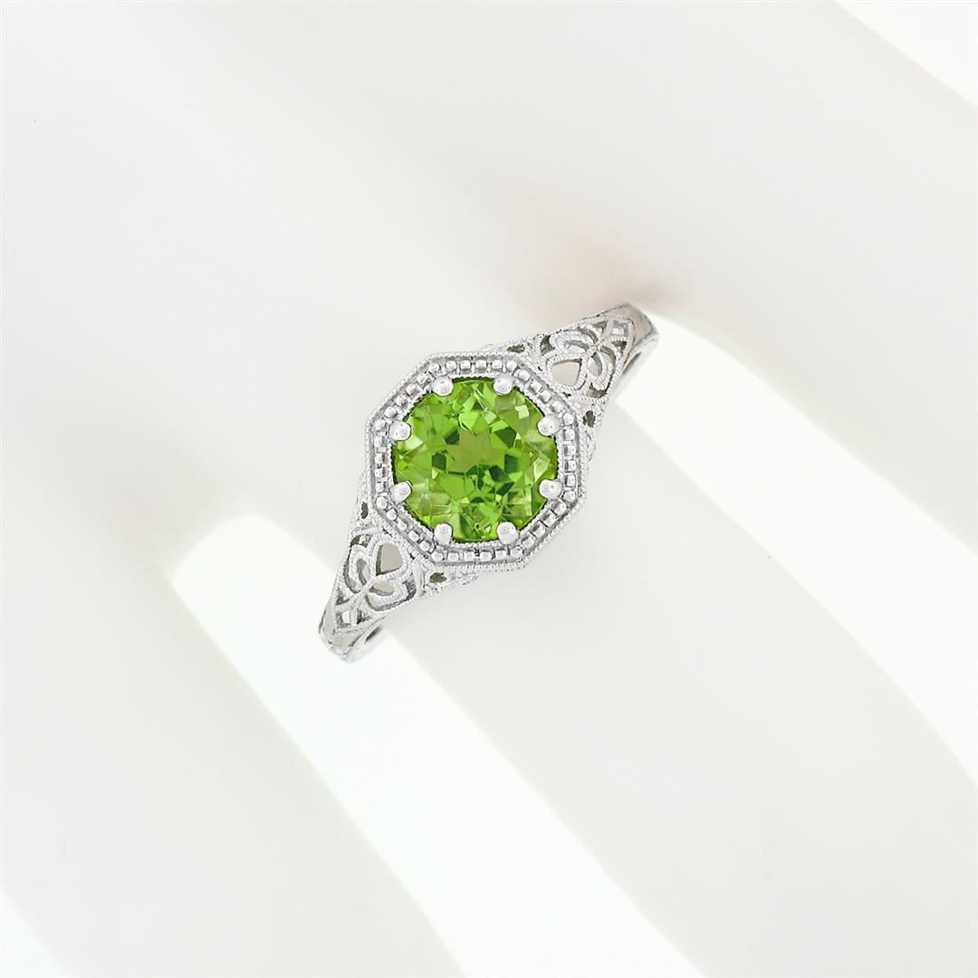 A new solid 14k white gold solitaire ring, with 1 round brilliant cut natural peridot (1.11ctw). The ring is size 6.5, weighs a total of 2.10 grams, and measures 8.92mm wide.
