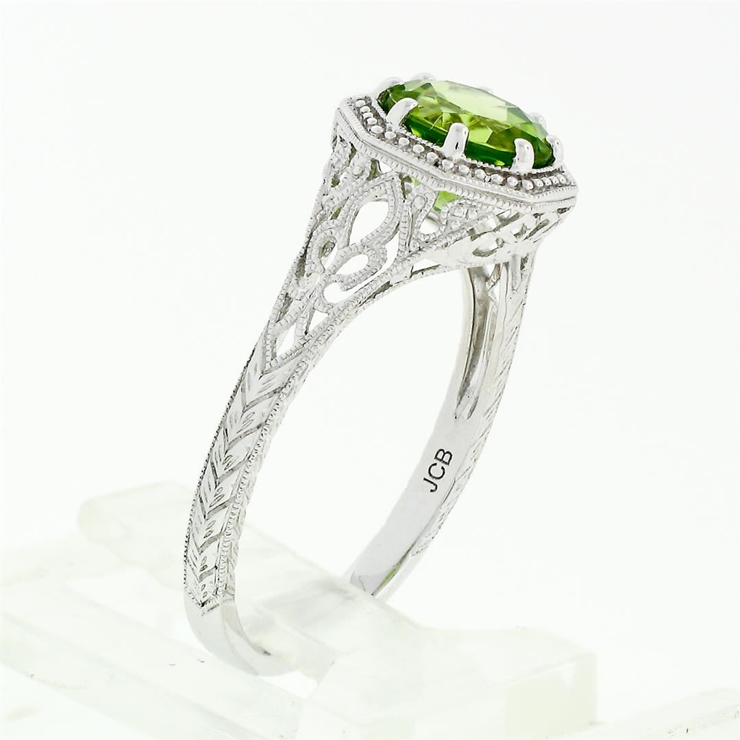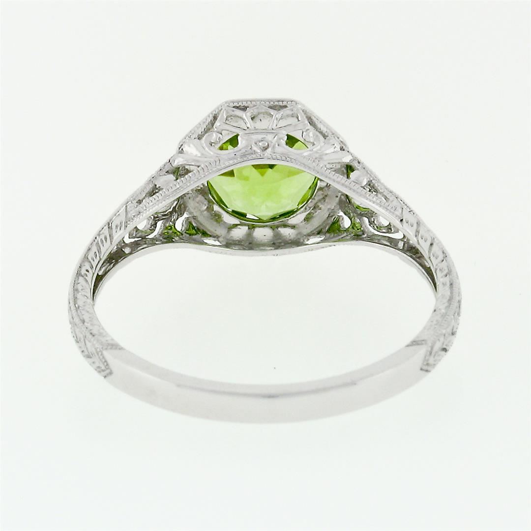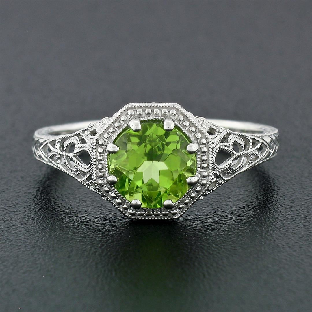 A new solid 14k white gold solitaire ring, with 1 round brilliant cut natural peridot (1.11ctw). The ring is size 6.5, weighs a total of 2.10 grams, and measures 8.92mm wide.