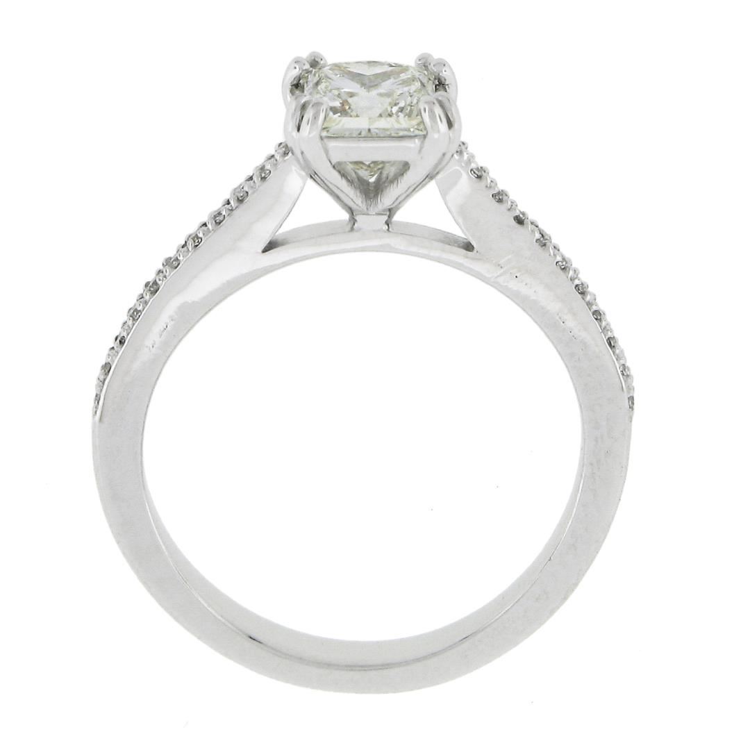 A new solid 14k white gold engagement ring, with 1 GIA graded princess cut natural diamond (L - VS1 ; 1.01ct ), and 22 round brilliant cut natural diamonds (G/H - VS1/VS2 ; 0.11ctw). The ring is size 6.0, weighs a total of 3.35 grams, and measures 6.9mm wide. Comes with all original relevant certifications.