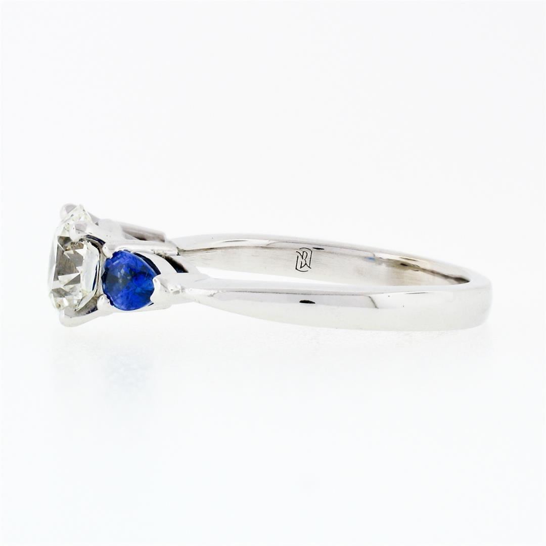 A new solid 14k white gold three-stone engagement ring with 1 GIA certified round brilliant cut natural diamond solitaire (G - VS2; 1.03ct) flanked by 2 pear cut rich blue natural sapphires (0.44ctw). The ring is size 5.5, weighs a total of 3.22 grams, and measures 6.46mm wide. Comes with all original relevant certifications.