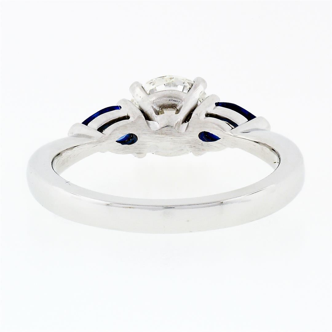 A new solid 14k white gold three-stone engagement ring with 1 GIA certified round brilliant cut natural diamond solitaire (G - VS2; 1.03ct) flanked by 2 pear cut rich blue natural sapphires (0.44ctw). The ring is size 5.5, weighs a total of 3.22 grams, and measures 6.46mm wide. Comes with all original relevant certifications.