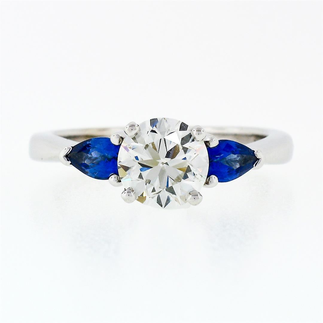 A new solid 14k white gold three-stone engagement ring with 1 GIA certified round brilliant cut natural diamond solitaire (G - VS2; 1.03ct) flanked by 2 pear cut rich blue natural sapphires (0.44ctw). The ring is size 5.5, weighs a total of 3.22 grams, and measures 6.46mm wide. Comes with all original relevant certifications.