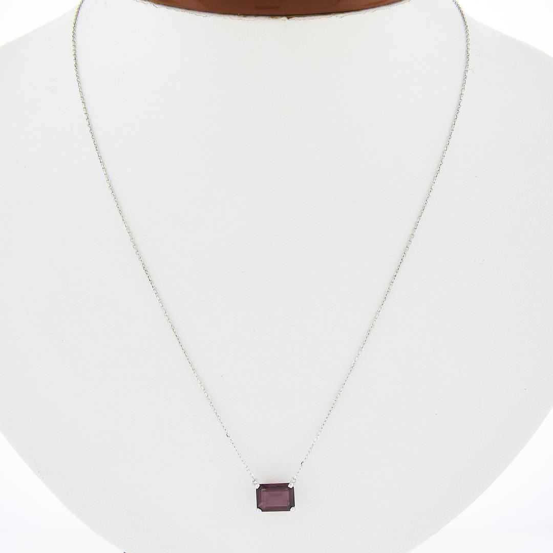 A new solid 14k white gold pendant necklace, with 1 rectangular step cut natural garnet (1.50ct). Adjustable at 16.5 & 18.5 inch cable link chain, 1.74 grams total weight, pendant measures 6.3x8.3mm.