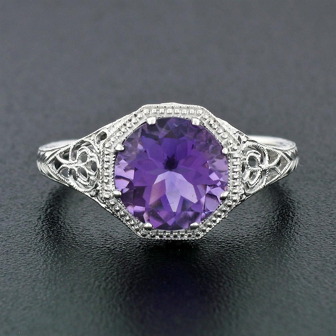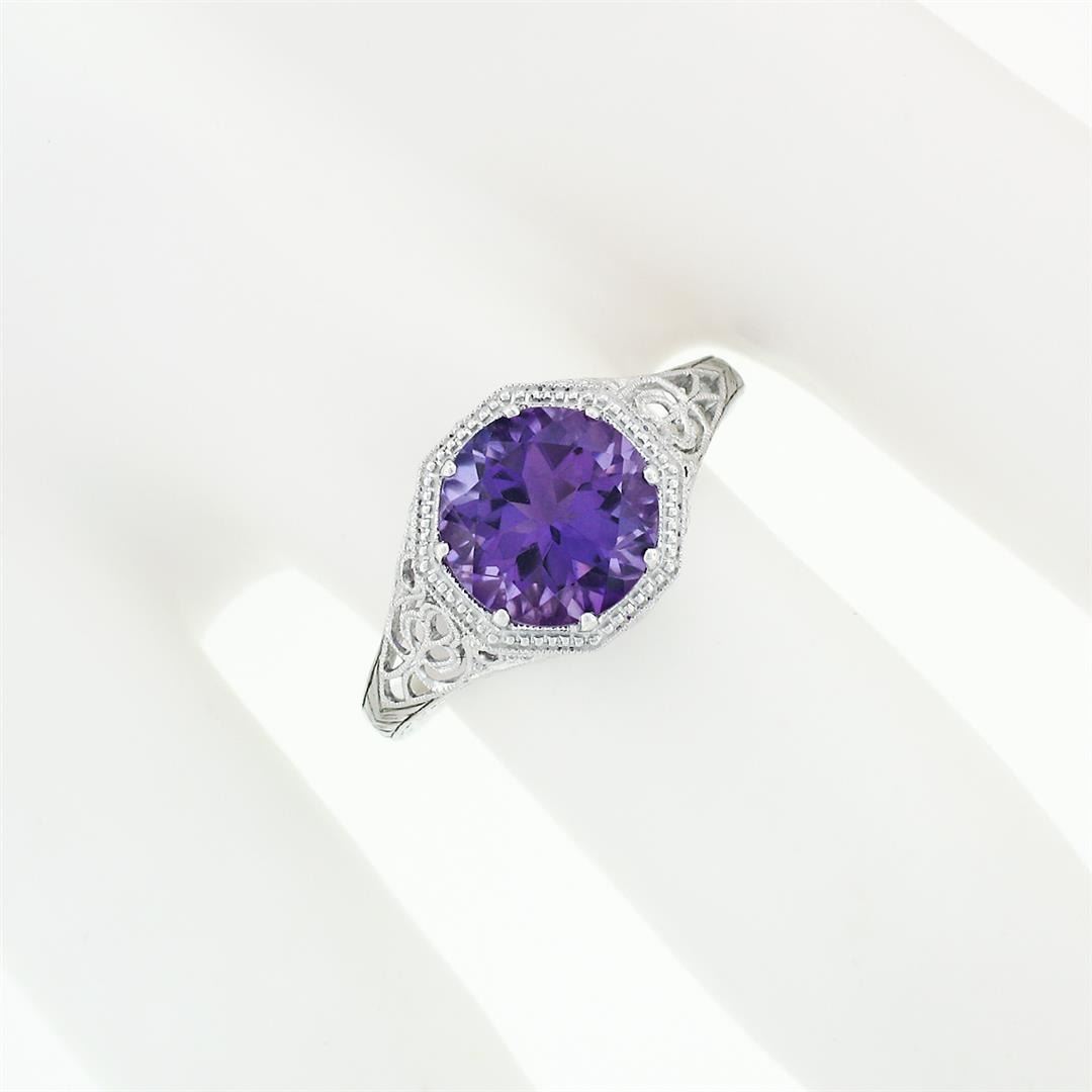 A new solid 14k white gold solitaire ring, with 1 round brilliant cut naural amethyst (8.12mm - 1.85ct). The ring is size 6.5, weighs a total of 2.20 grams, and measures 10.05mm wide.