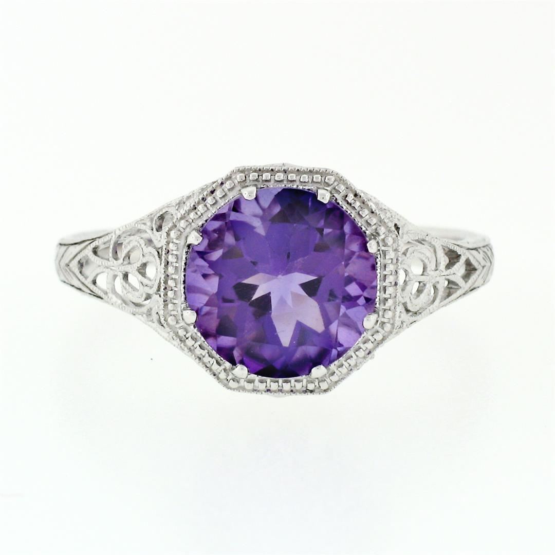 A new solid 14k white gold solitaire ring, with 1 round brilliant cut naural amethyst (8.12mm - 1.85ct). The ring is size 6.5, weighs a total of 2.20 grams, and measures 10.05mm wide.