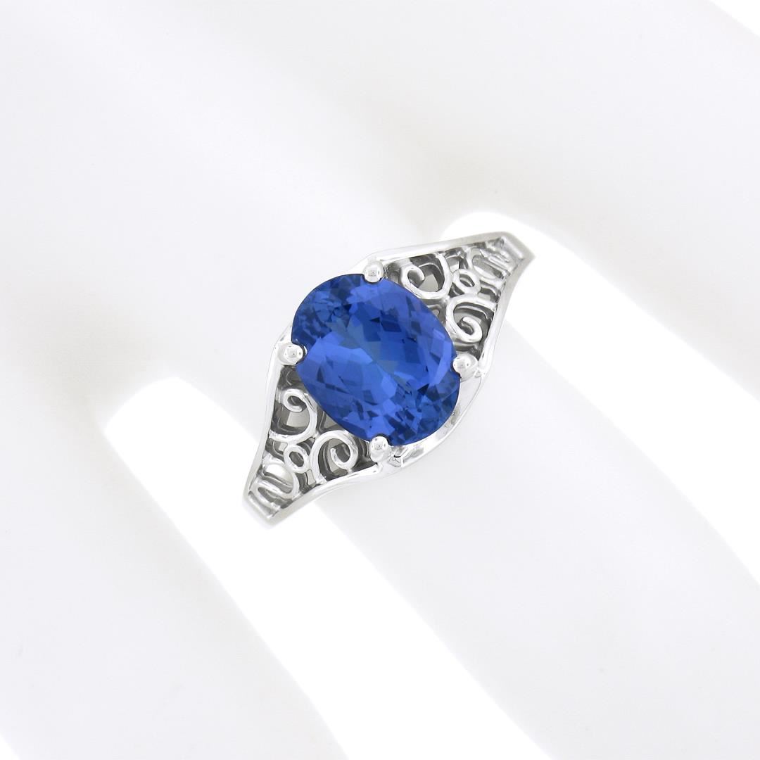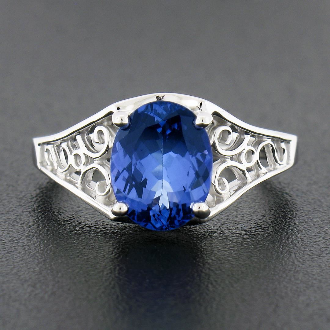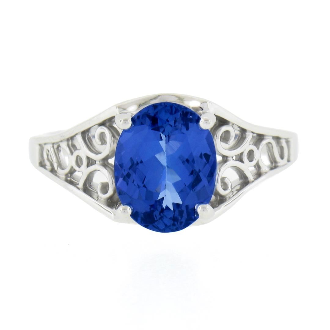 A new 14k white gold rong, with 1 oval cut natural tanzanite (1.91ct). The ring is size 6.5, weighs a total of 3.67 grams, and measures 9.6mm wide.