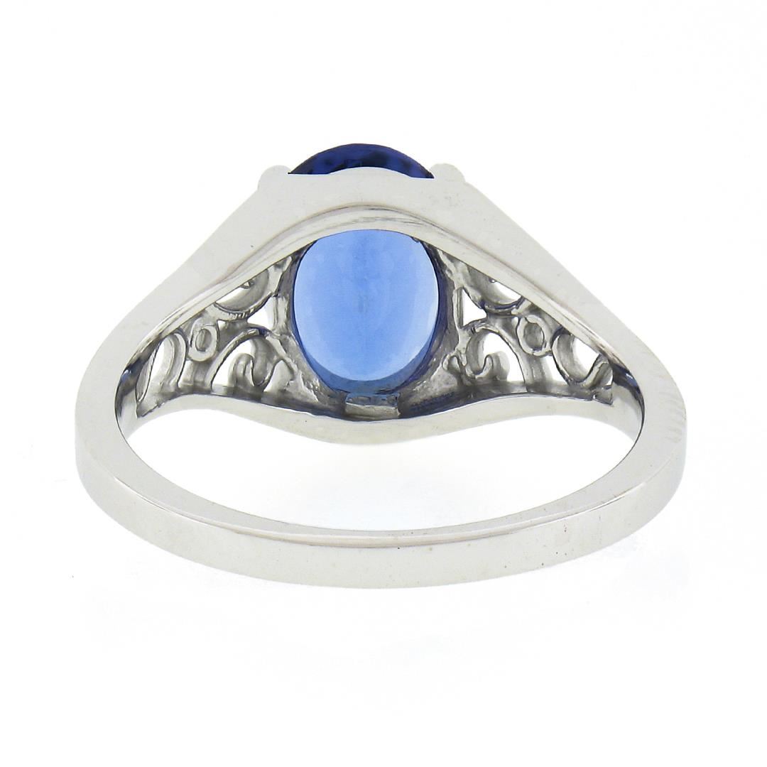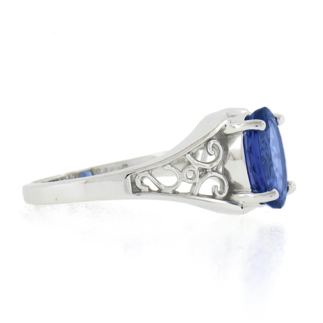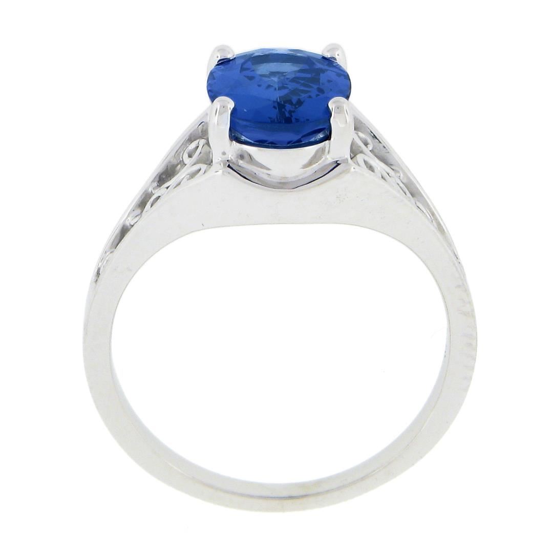 A new 14k white gold rong, with 1 oval cut natural tanzanite (1.91ct). The ring is size 6.5, weighs a total of 3.67 grams, and measures 9.6mm wide.