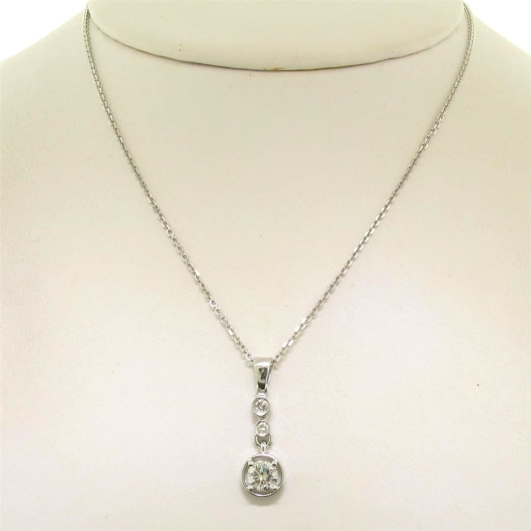 A new solid 14k white gold dangle pendant necklace, with 3 round brilliant cut natural diamonds (G/H- VS2; 0.67ctw). The pendant weighs a total of 3.6 grams, measures 23.3x7.65mm including the bail, and 17 inch fine cable link chain.