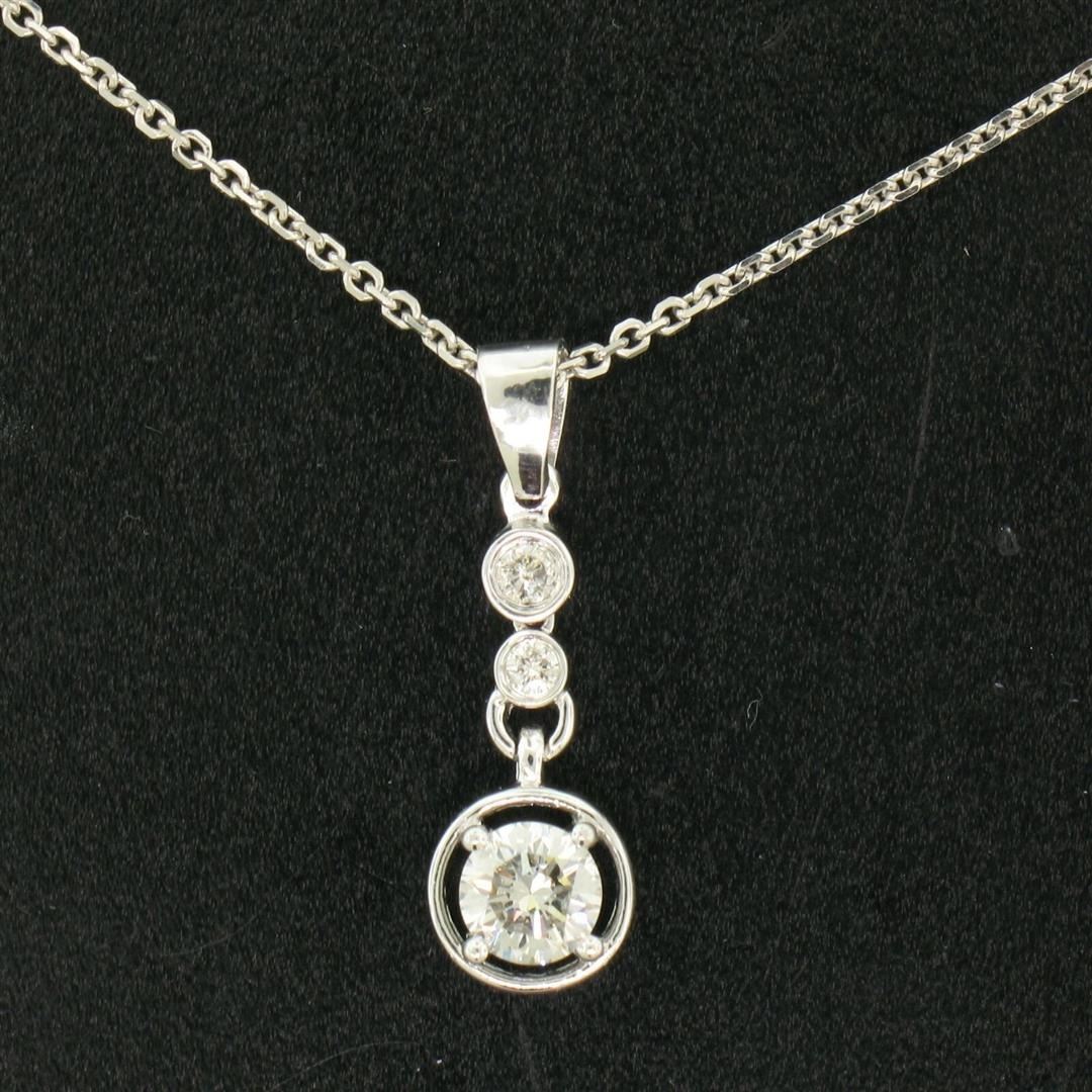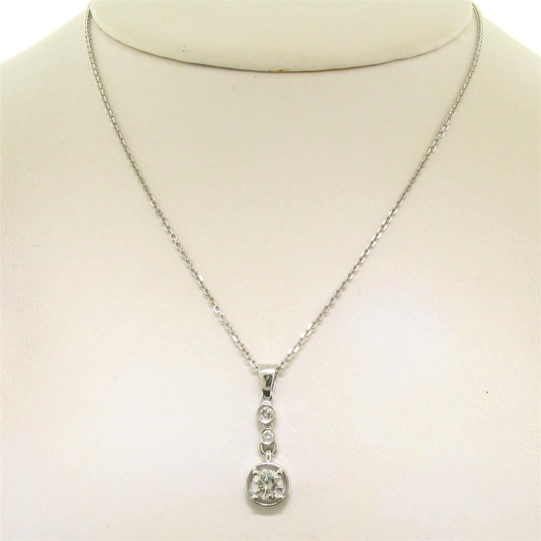 A new solid 14k white gold dangle pendant necklace, with 3 round brilliant cut natural diamonds (G/H- VS2; 0.67ctw). The pendant weighs a total of 3.6 grams, measures 23.3x7.65mm including the bail, and 17 inch fine cable link chain.