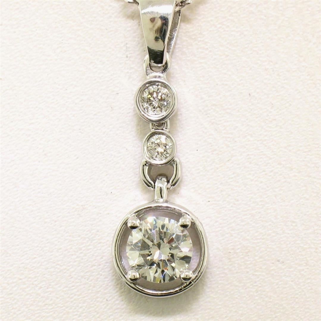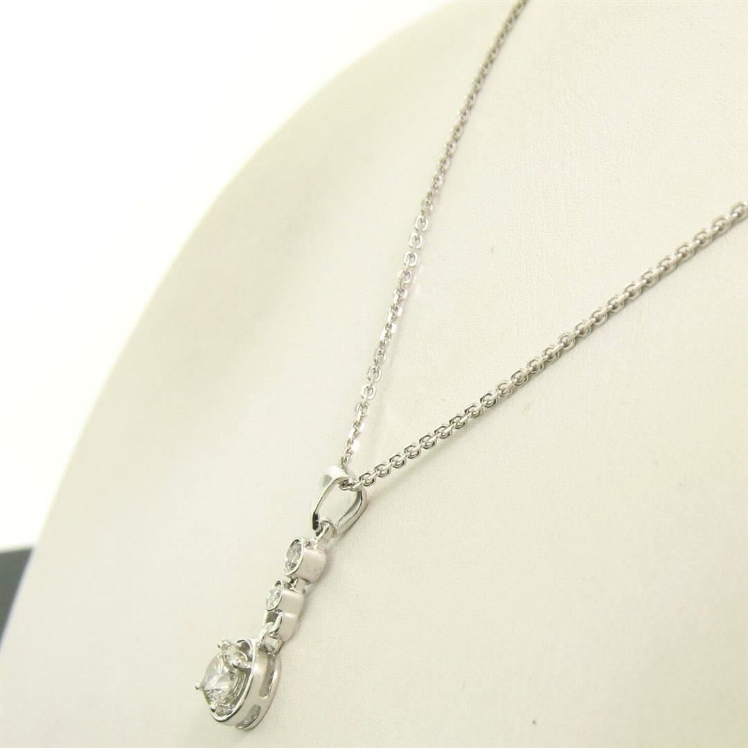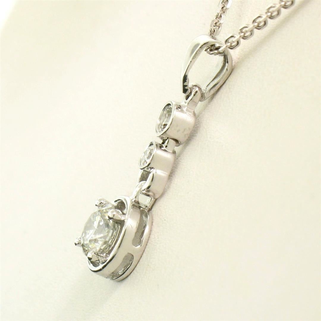 A new solid 14k white gold dangle pendant necklace, with 3 round brilliant cut natural diamonds (G/H- VS2; 0.67ctw). The pendant weighs a total of 3.6 grams, measures 23.3x7.65mm including the bail, and 17 inch fine cable link chain.