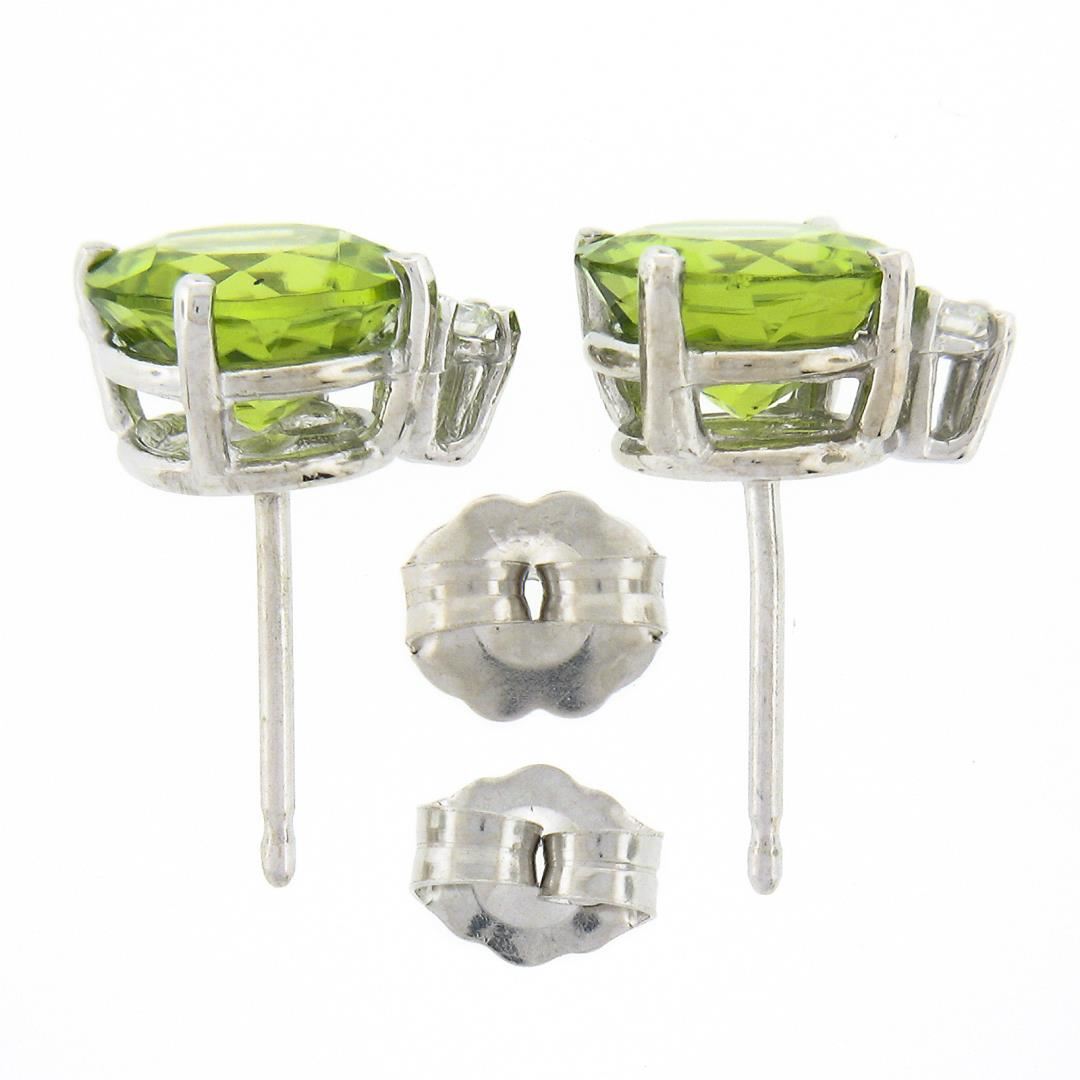A new solid 14k white gold stud earrings, with 2 round cut natural peridots (7.2mm / 2.80ctw ), and 2 round brilliant cut natural diamonds (G/H - SI1/SI2 ; 0.06ctw ). The earrings measure approximately 9.6x7.2mm and weigh a total of 1.93 grams.