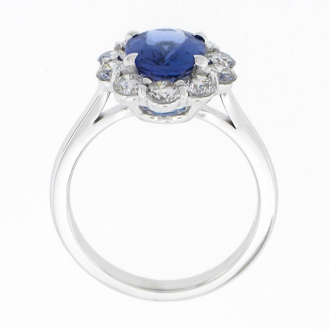 A new solid 14k white gold ring, with 1 oval cut natural tanzanite (9.22x7.22mm / 1.87ct), and a halo of 10 round brilliant cut natural diamonds (F/G - SI1/SI2 ; 1.08ctw). The ring is size 6.5, weighs a total of 4.37 grams, and measures 14.80mm wide.