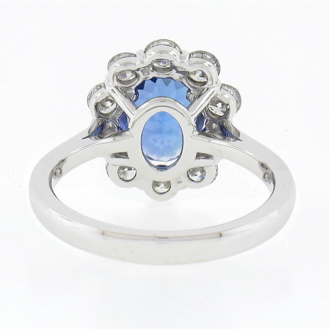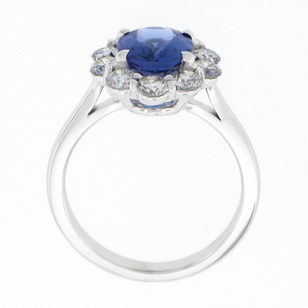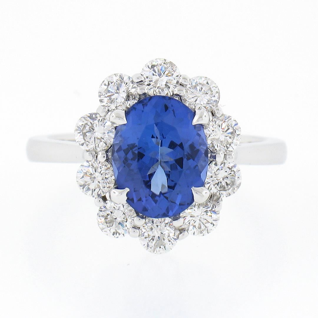 A new solid 14k white gold ring, with 1 oval cut natural tanzanite (9.22x7.22mm / 1.87ct), and a halo of 10 round brilliant cut natural diamonds (F/G - SI1/SI2 ; 1.08ctw). The ring is size 6.5, weighs a total of 4.37 grams, and measures 14.80mm wide.
