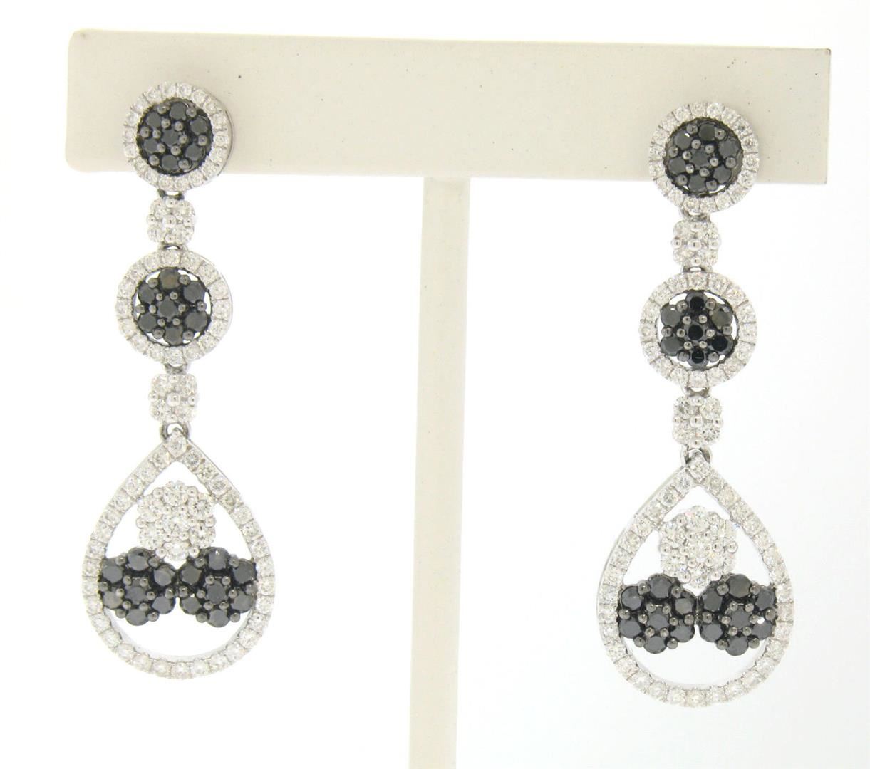 NEW 14k White Gold 3.74ctw White and Black Diamond Long Dangle Drop Earrings. Please see photos and description for all available information. A new solid 14k white gold dqangle drop earrings, featuring 164 white round brilliant cut natural diamonds and 56 black round brilliant cut natural diamonds (G/H- VS2-SI1; 3.74ctw). The earrings measure approximately 41.91x12.7mm and weigh a total of 7.20 grams.