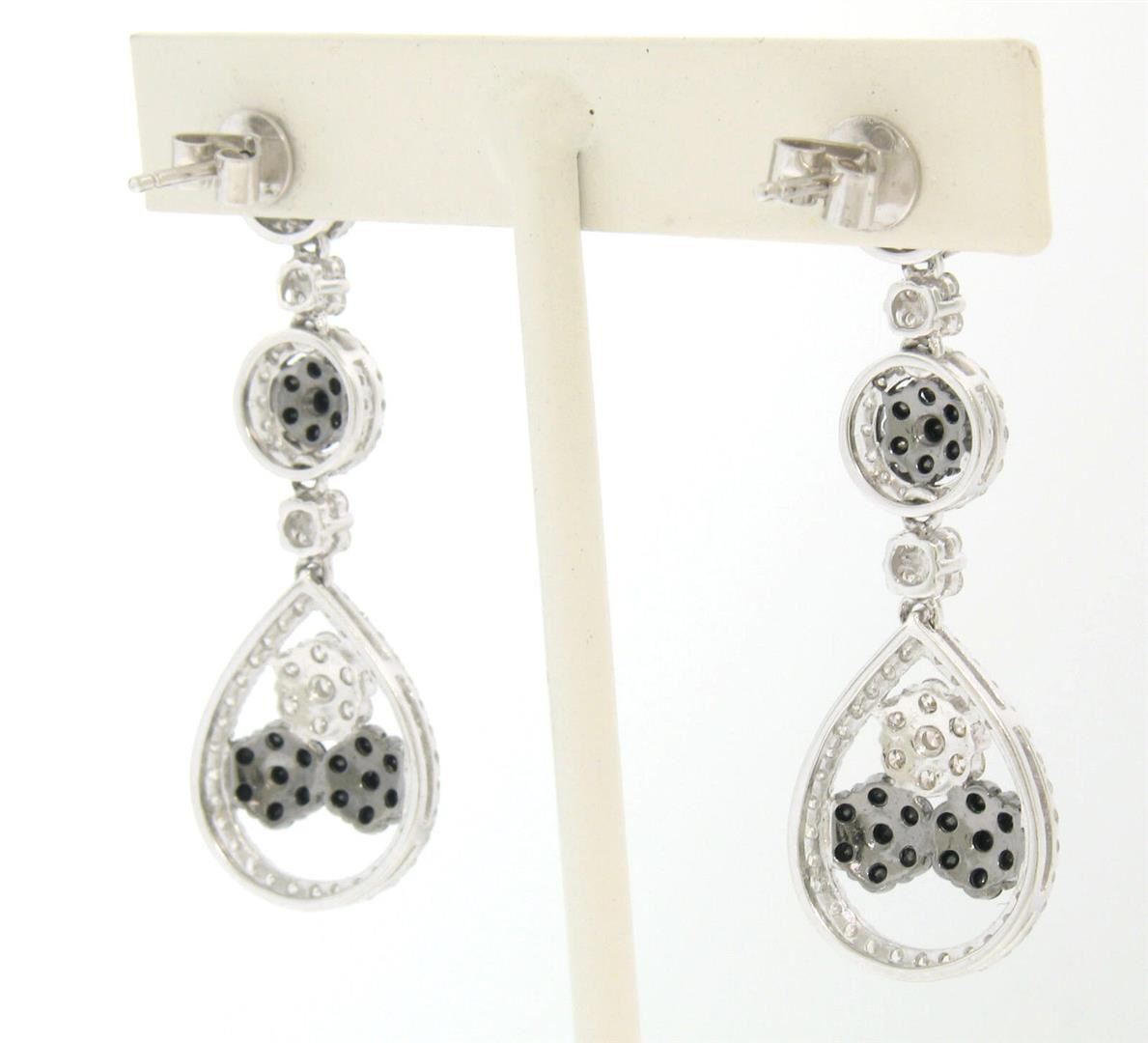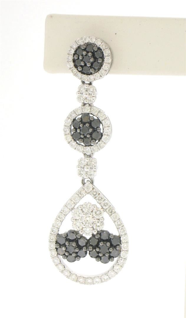 NEW 14k White Gold 3.74ctw White and Black Diamond Long Dangle Drop Earrings. Please see photos and description for all available information. A new solid 14k white gold dqangle drop earrings, featuring 164 white round brilliant cut natural diamonds and 56 black round brilliant cut natural diamonds (G/H- VS2-SI1; 3.74ctw). The earrings measure approximately 41.91x12.7mm and weigh a total of 7.20 grams.