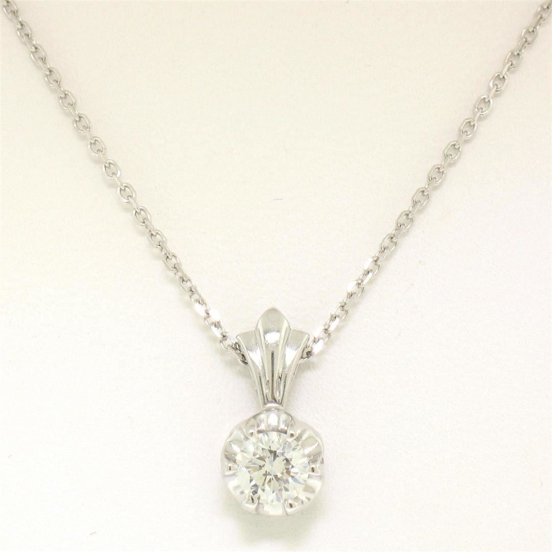 One NEW 14k White Gold .45ct F VS2 Round Brilliant Diamond Solitaire Pendant & Chain. Item Details: Material: 14K Solid White Gold, Weight: 2.60 Grams, Stone(s): (1) Natural Genuine Diamond - Round Brilliant Cut - Illusion Prong Set - VS2 Clarity - F Color, Total Carat Weight: 0.45 (approx.), Chain Type: Cable Link, Chain Length: 16 Inches, Clasp: Lobster Claw, Width: 6.7mm Height: 13.5mm (including the bail) Thickness: 5.85mm Condition: New w/o Tag