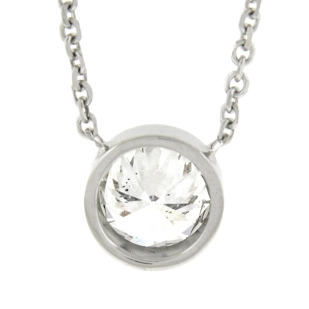 A new solid 14k white gold solitaire pendant necklace, with 1 GIA graded round cut natural diamond (F - SI1 ; 0.84ct). Adjustable to 16 or 18 inch cable link chain, 2.70 grams total weight, pendant measures 7.3mm. Comes with all original relevant certifications.