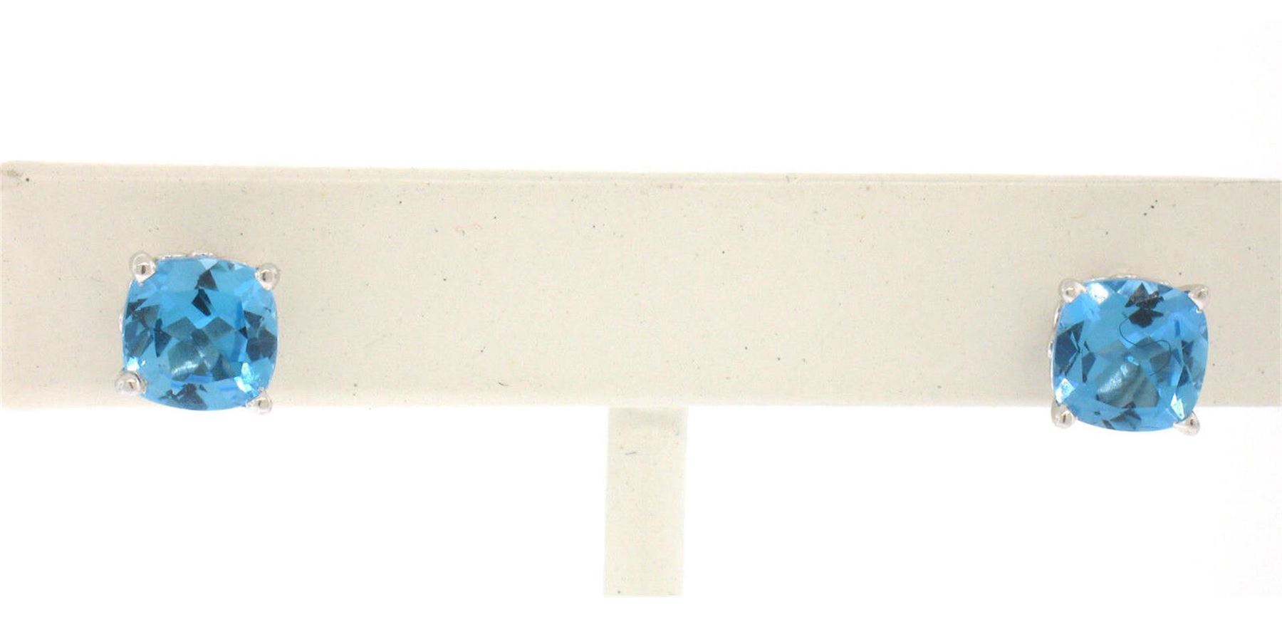 NEW 14k White Gold Cushion Cut Natural Swiss Blue Topaz Solitaire Stud Earrings. Please see photos and description for all available information. A new solid 14k white gold pair of stud earrings, with 2 cushion brilliant cut natural topaz (2.20ctw ). The earrings measure approximately 6.2x6.1mm and weigh a total of 1.7 grams.
