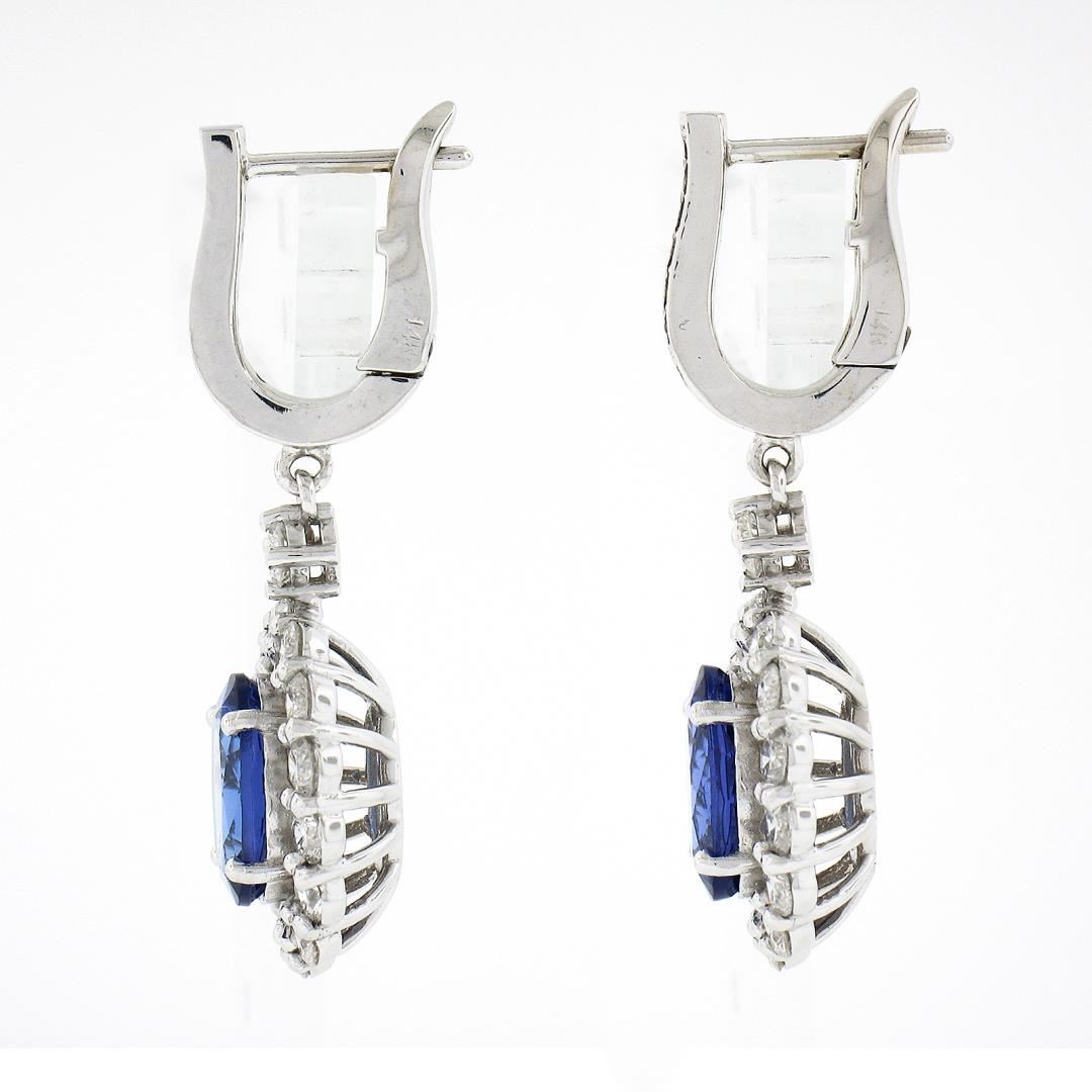 A new solid 14k white gold drop dangle earrings, with 2 ocal cut natural tanzanite (3.75ctw), and 46 round brilliant cut natural diamonds (G/H - SI1/SI2 ;1.48ctw). The earrings measure approximately 33x12.8mm and weigh a total of 7.18 grams.