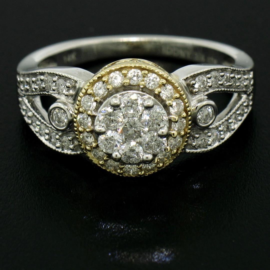 A new solid 14k yellow and white gold cluster ring, with 49 round brilliant cut natural diamonds (F/G- VS1; 0.75ctw). The ring is size 7.0, weighs a total of 4.60 grams, and measures 10.5mm wide.