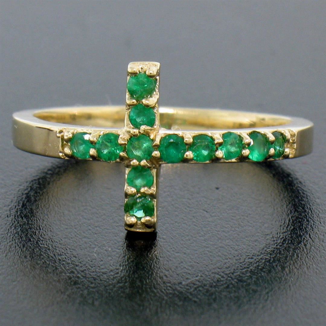A new solid 14k yellow gold cross band ring, with 12 round brilliant cut natural emeralds (0.25ctw). The ring is size 6.0, weighs a total of 2.3 grams, and measures 11.0mm wide.