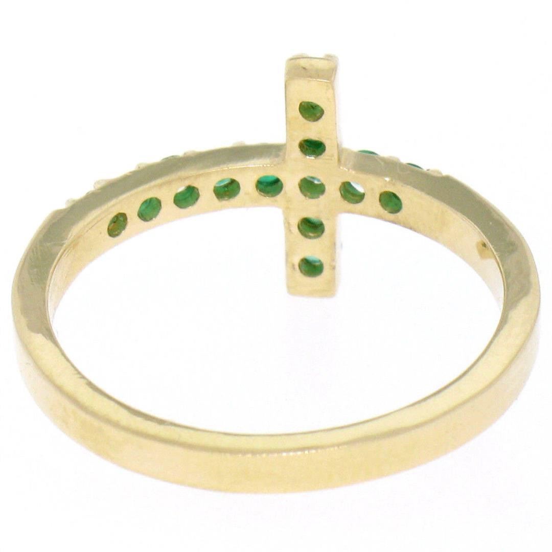 A new solid 14k yellow gold cross band ring, with 12 round brilliant cut natural emeralds (0.25ctw). The ring is size 6.0, weighs a total of 2.3 grams, and measures 11.0mm wide.