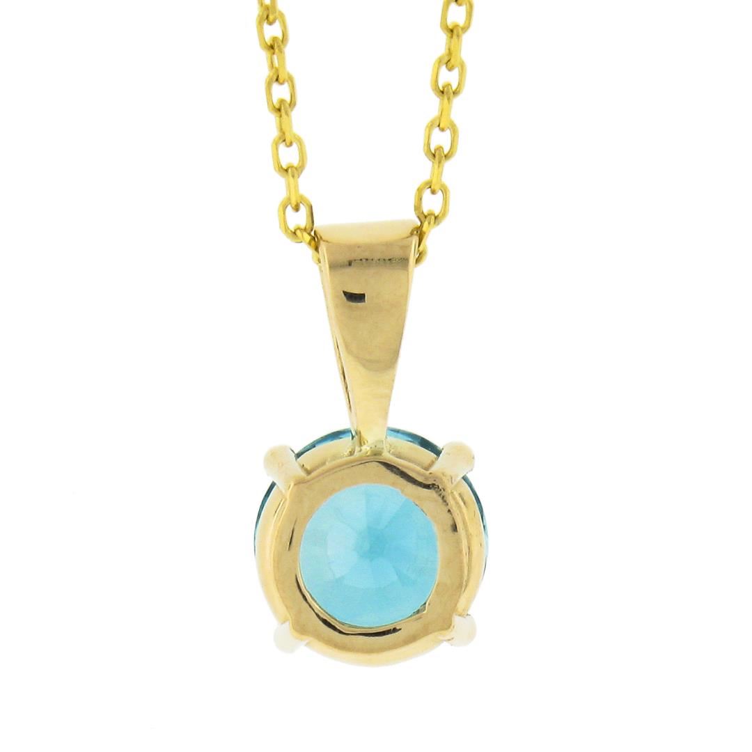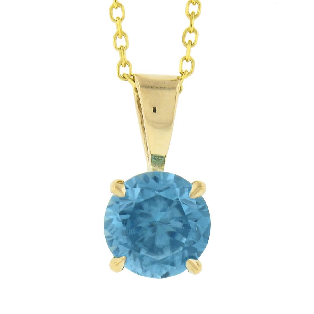 A new solid 14k yellow gold pendant necklace, with 1 round cut natural zircon (1.35ct). Adjustable 16 or 18 inch cable link chain, 1.77 grams total weight, pendant measures 11.5x6mm.