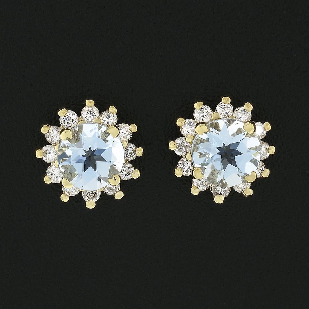 A new solid 14k yellow gold stud earrings, featuring 2 round cut natural aquamarine (5.9mm - 1.40ct), surrounded with a halo of 24 round brilliant cut natural diamonds (G/H - VS1/VS2 ; 0.72ct). The earrings measure approximately 9.5mm in diameter and weigh a total of 2.4 grams.