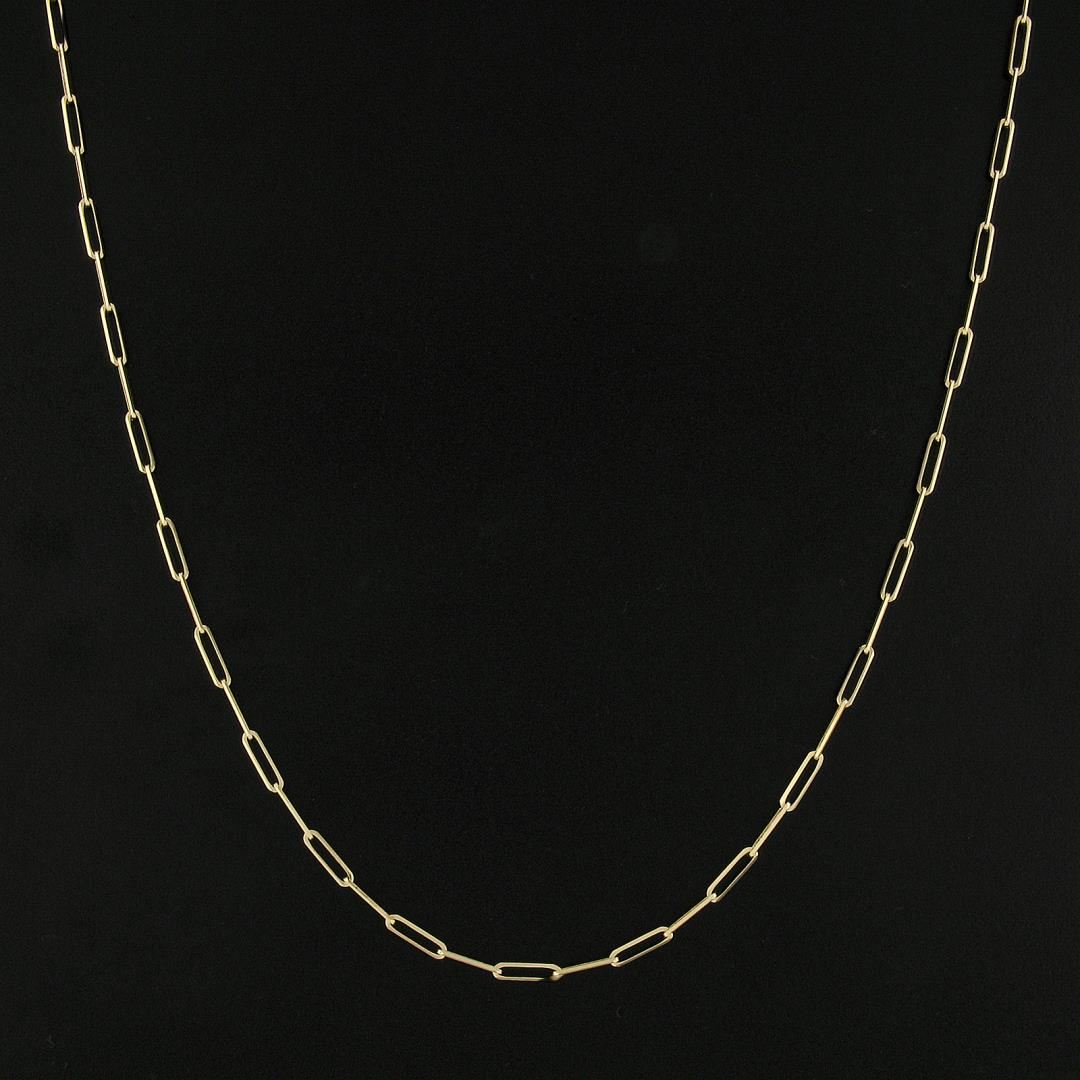 A new solid 14k yellow gold papeclip link necklace. It weighs a total of 5.27 grams, measures 2.6mm wide, and measures 20 inches in length.