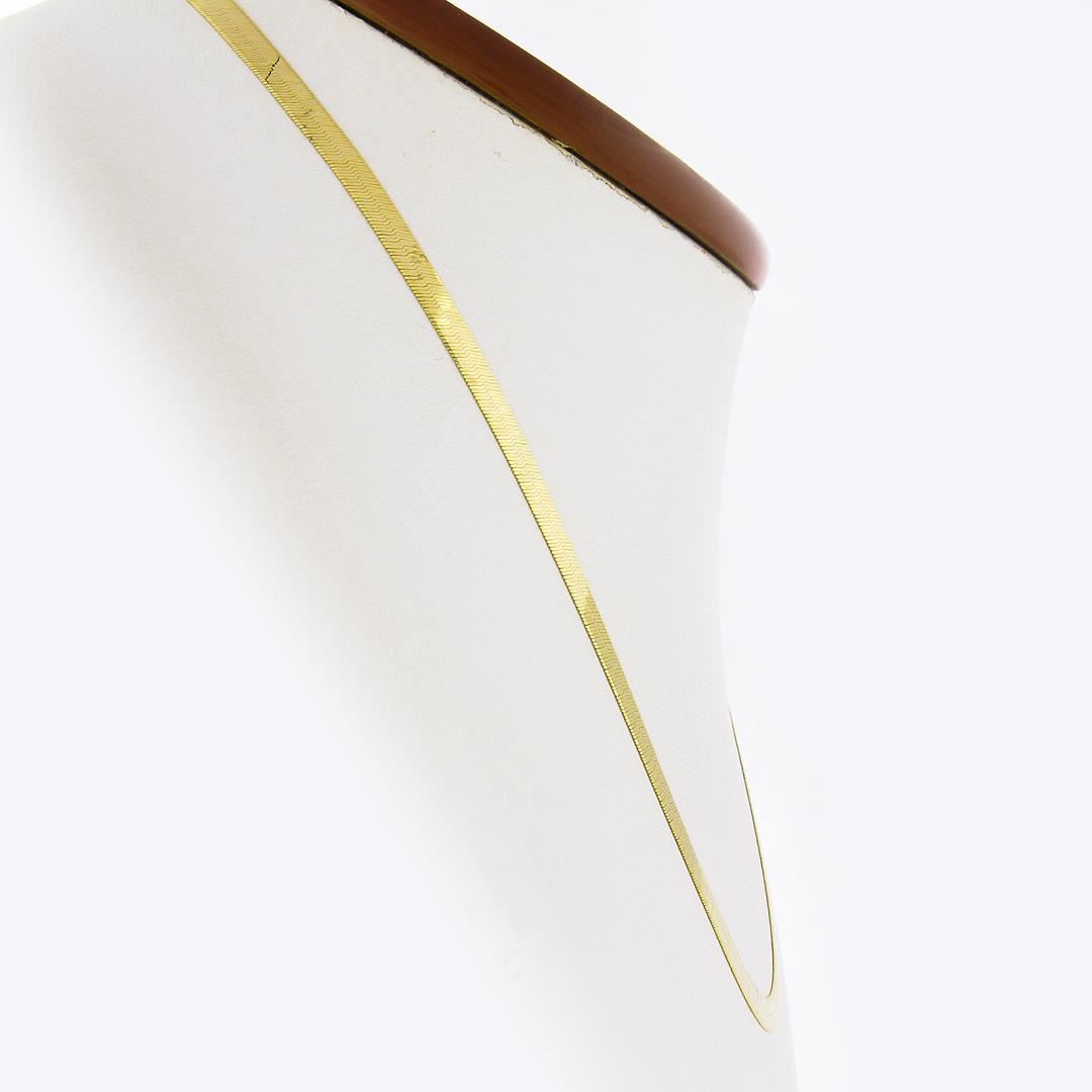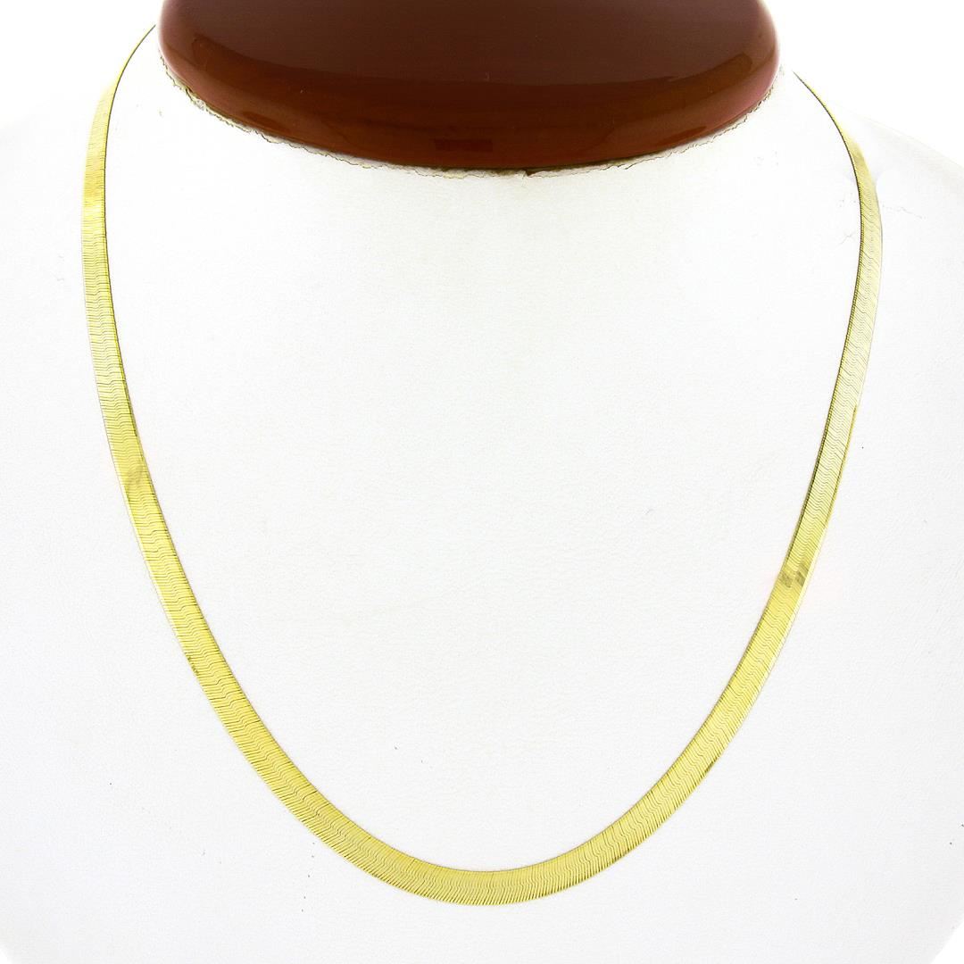 A new solid 14k yellow gold flat herringbone link necklace. It weighs a total of 5.70 grams, measures 4mm wide, and measures 16 inches in length.