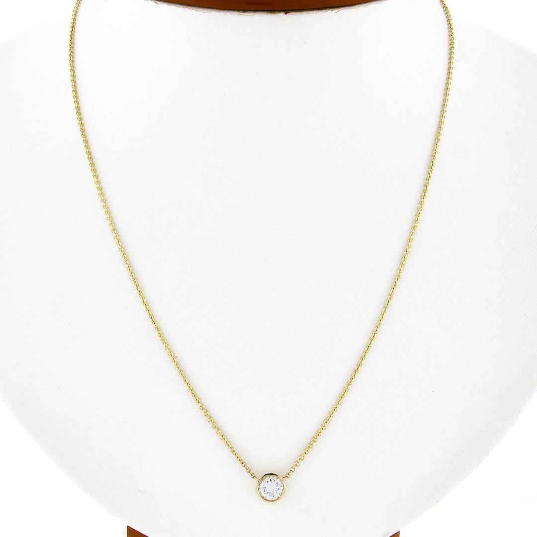A new solid 14k yellow gold solitaire pendant neckalce, featuring 1 round brilliant cut natural diamond (J - VS2 ; 0.60ct). adjustable at 16 or 18 Inches cable link chain, 2.73 grams total weight, pendant measures 6.7mm in diameter.