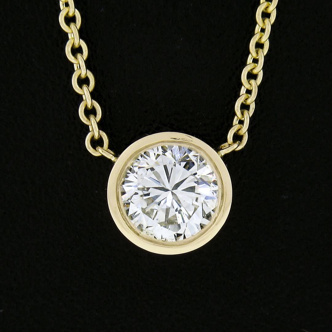 A new solid 14k yellow gold solitaire pendant neckalce, featuring 1 round brilliant cut natural diamond (J - VS2 ; 0.60ct). adjustable at 16 or 18 Inches cable link chain, 2.73 grams total weight, pendant measures 6.7mm in diameter.
