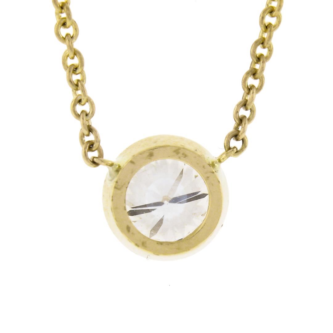 A new solid 14k yellow gold solitaire pendant neckalce, featuring 1 round brilliant cut natural diamond (J - VS2 ; 0.60ct). adjustable at 16 or 18 Inches cable link chain, 2.73 grams total weight, pendant measures 6.7mm in diameter.